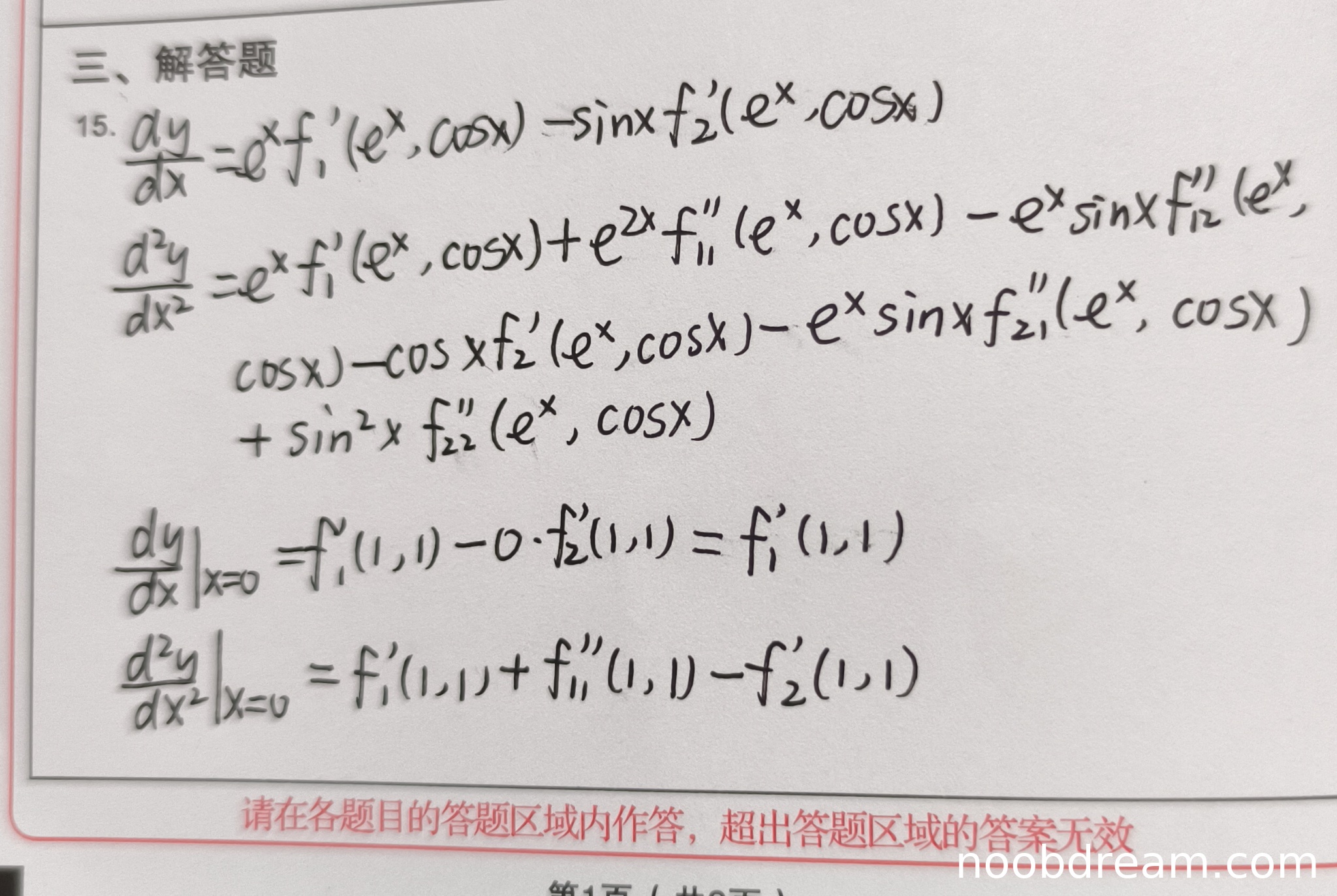 学生在计算二阶导数时,表达式基本正确,但在代入 \(x=0\) 时,结果 \(\left.\frac{d^2y}{dx^2}\right|_{x=0} = f_1'(1,1) + f_{11}''(1,1) - f_2'(1,1)\) 比标准答案多了一项 \(f_1'(1,1)\)。标准答案为 \(f_{11}''(1,1) + f_1'(1,1) - f_2'(1,1)\),学生多出的 \(f_1'(1,1)\) 是由于在二阶导数表达式中错误地保留了 \(e^x f_1'(e^x, \cos x)\) 项,而实际上该项在求导后应与其他项合并或消去。这是一个逻辑错误,因此扣2分,得3分。