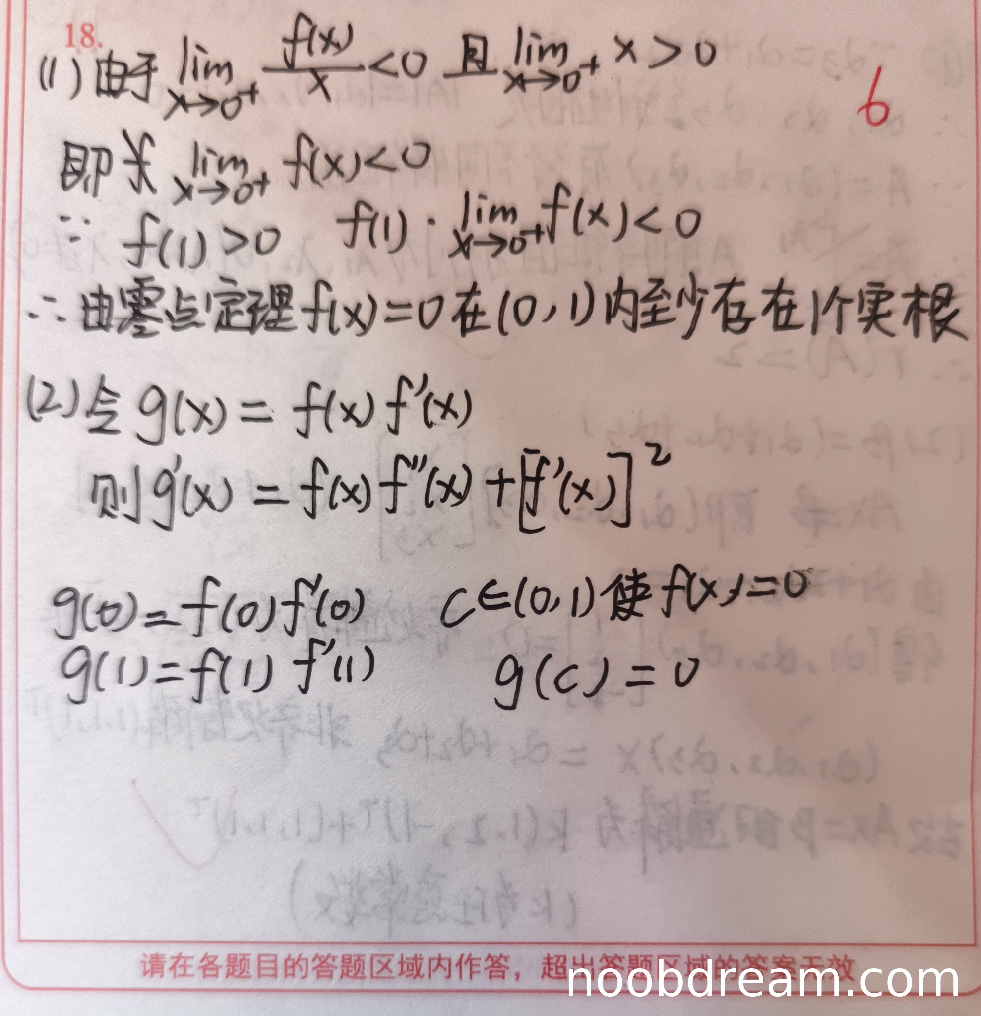 学生正确构造了\(g(x) = f(x)f'(x)\),并指出\(g'(x)\)即为所求方程的左端。找到了\(g(c) = 0\)(其中\(c\)是\(f(x)=0\)的根)。但未证明存在第二个零点。标准答案中通过\(f'(0) < 0\)和拉格朗日中值定理得到\(f'(\eta) > 0\),进而由零点定理得到\(f'(\xi_1) = 0\),从而\(g(\xi_1) = 0\)。学生缺少这一关键步骤,无法证明存在两个不同实根。扣3分,得2分。