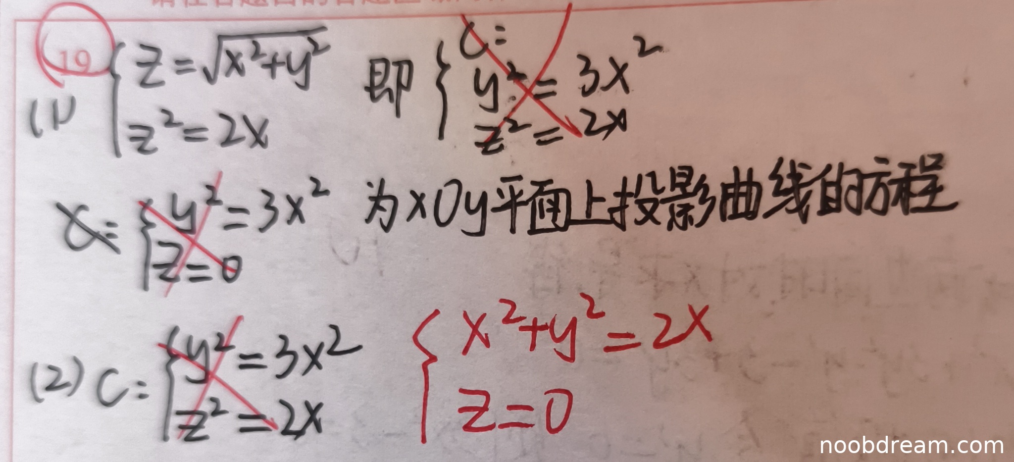 学生第一次识别结果中给出的投影曲线方程为 \(y^2 = 3x^2, z=0\),这是错误的,因为从 \(z = \sqrt{x^2+y^2}\) 和 \(z^2=2x\) 消去 \(z\) 应得到 \(x^2+y^2=2x\),而不是 \(y^2=3x^2\)。第二次识别结果正确指出错误并给出正确方程 \(x^2+y^2=2x, z=0\)(即 \((x-1)^2+y^2=1, z=0\))。由于第二次识别正确,且根据规则“只要其中有一次回答正确则不扣分”,因此不扣分。但第一次识别中的逻辑错误需注意,但整体不扣分。得5分。