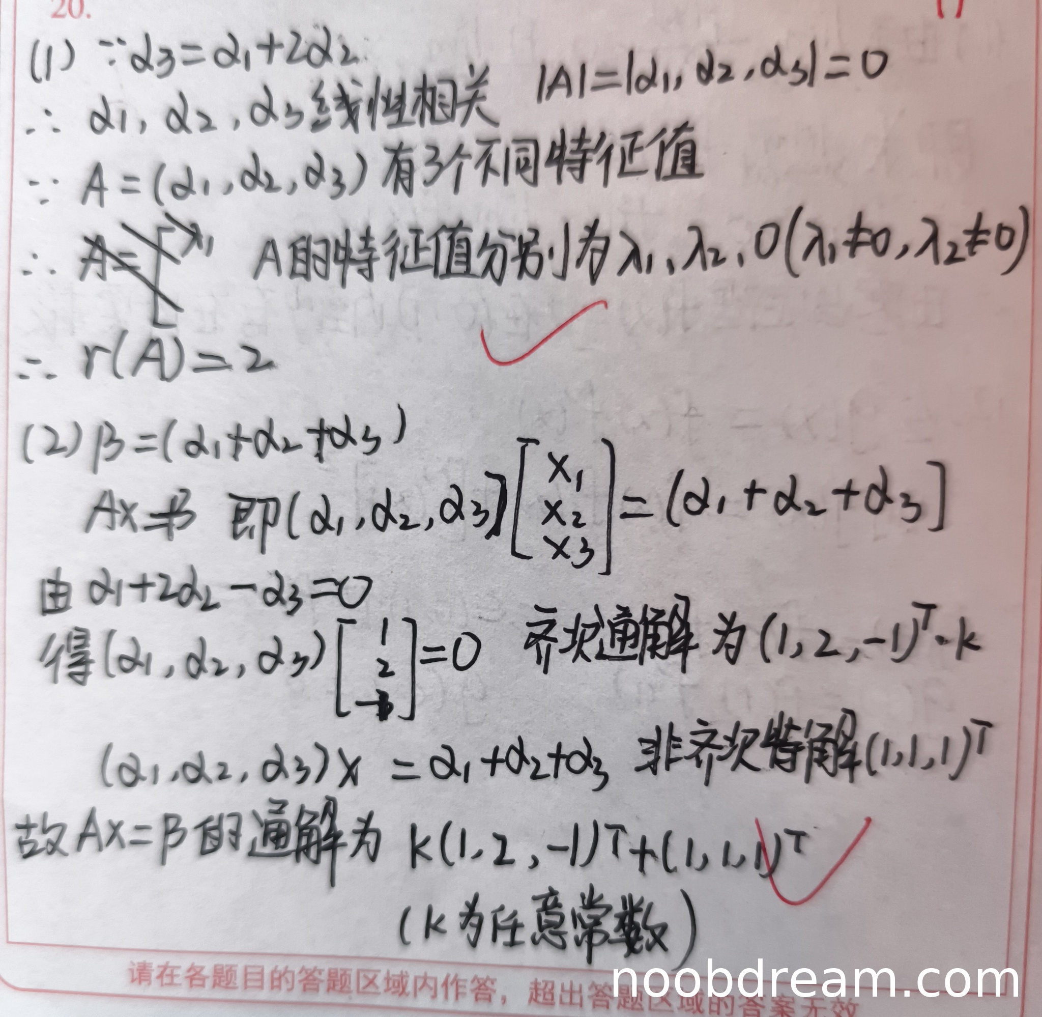学生作答中,第1次识别结果与第2次识别结果在核心逻辑上一致。学生正确指出由α₃ = α₁ + 2α₂可得α₁, α₂, α₃线性相关,从而|A|=0,因此0是A的特征值。由于A有三个不同的特征值,0是单根,且A可对角化,故秩为2。虽然学生没有明确写出相似对角化的步骤,但通过特征值分析得出秩为2的结论是正确的。逻辑完整,没有错误。但表述上略有简略,未详细说明相似对角化与秩的关系,不过核心推理正确。扣1分以反映表述不够严谨。