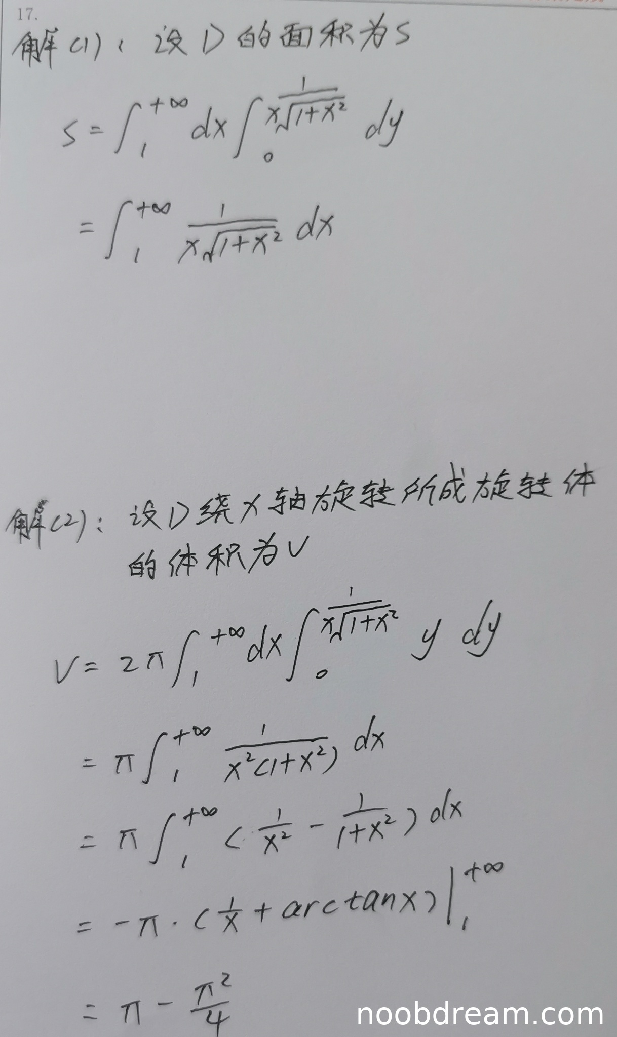学生正确使用了旋转体体积的公式,通过二重积分方法得到 V = π∫₁^∞ [1/(x²(1+x²))] dx。然后正确进行了部分分式分解,积分计算过程正确,最终得到了正确结果 π(1 - π/4)。虽然学生写成了 π - π²/4,但这只是表达形式不同,数值上是等价的。因此给满分6分。