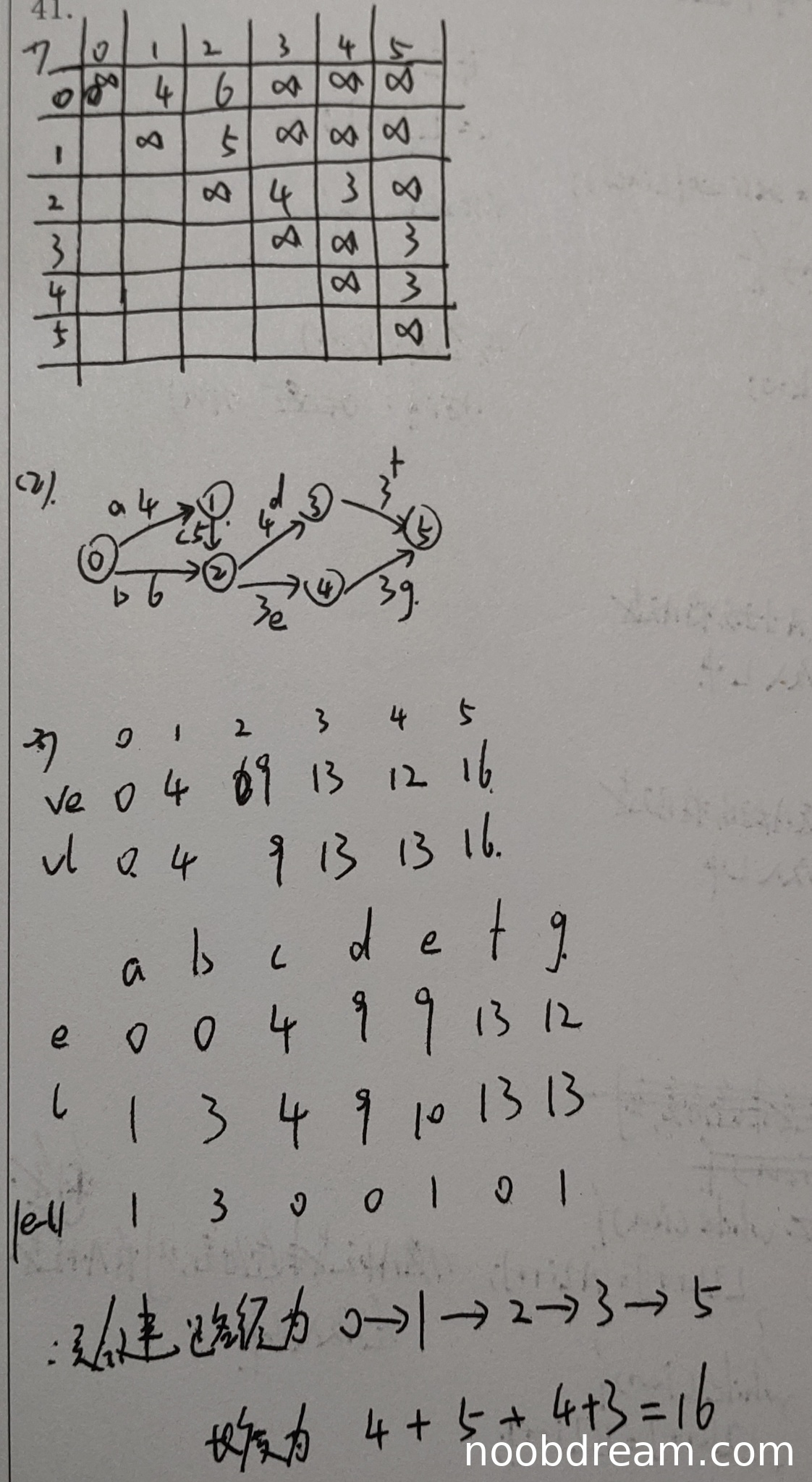 学生正确给出了关键路径0→1→2→3→5和路径长度16,计算过程正确。虽然学生额外列出了ve、vl等关键路径计算过程,但未影响最终答案的正确性。得4分。
