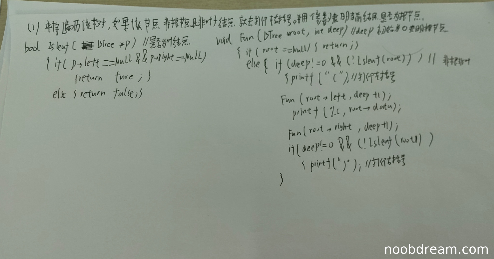 理由:学生的基本设计思想正确,即通过中序遍历表达式树,并在非根节点和非叶子节点处添加括号。这与标准答案的思路一致。但是,学生在描述中提到了"deep初始为0表明根节点",这与标准答案中根节点深度为1的设定不同,虽然不影响算法逻辑,但表述不够精确。此外,学生没有明确说明"最外层不需要括号"这一关键点,扣1分。代码实现中存在逻辑错误(见第二问扣分),但设计思想部分不涉及具体代码实现,因此只扣1分。