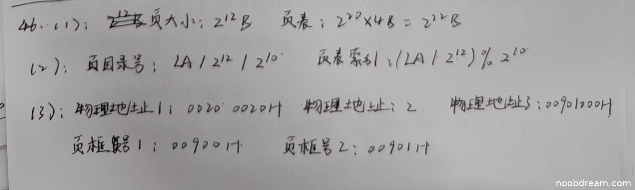 学生正确计算出页大小为 2^12 B = 4 KB(1分)。页表项数为 2^20,页表最大占用 2^20 × 4 B = 2^22 B = 4 MB(2分)。答案与标准答案一致,得3分。