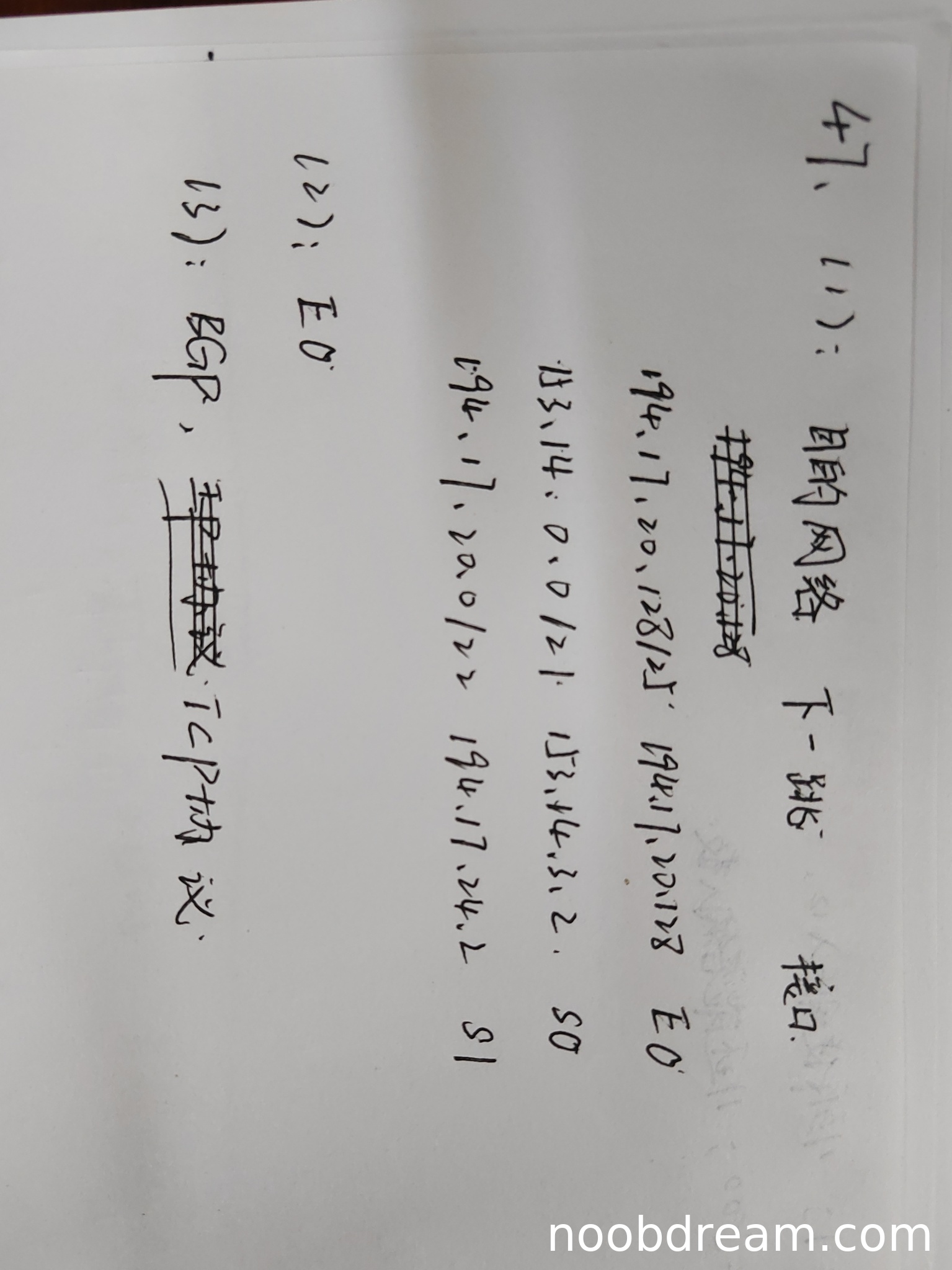 学生答案中缺少到达AS1子网的路由(153.14.5.0/24),且对AS2内部子网的聚合不正确(194.17.0.0/21和194.17.20.0/22覆盖范围与题目子网不匹配,且未正确聚合)。每个路由项2分,但学生答案中仅有一个路由项(194.17.20.128/25)完全正确,其余两个路由项目的网络和下一跳均错误,因此仅得2分。