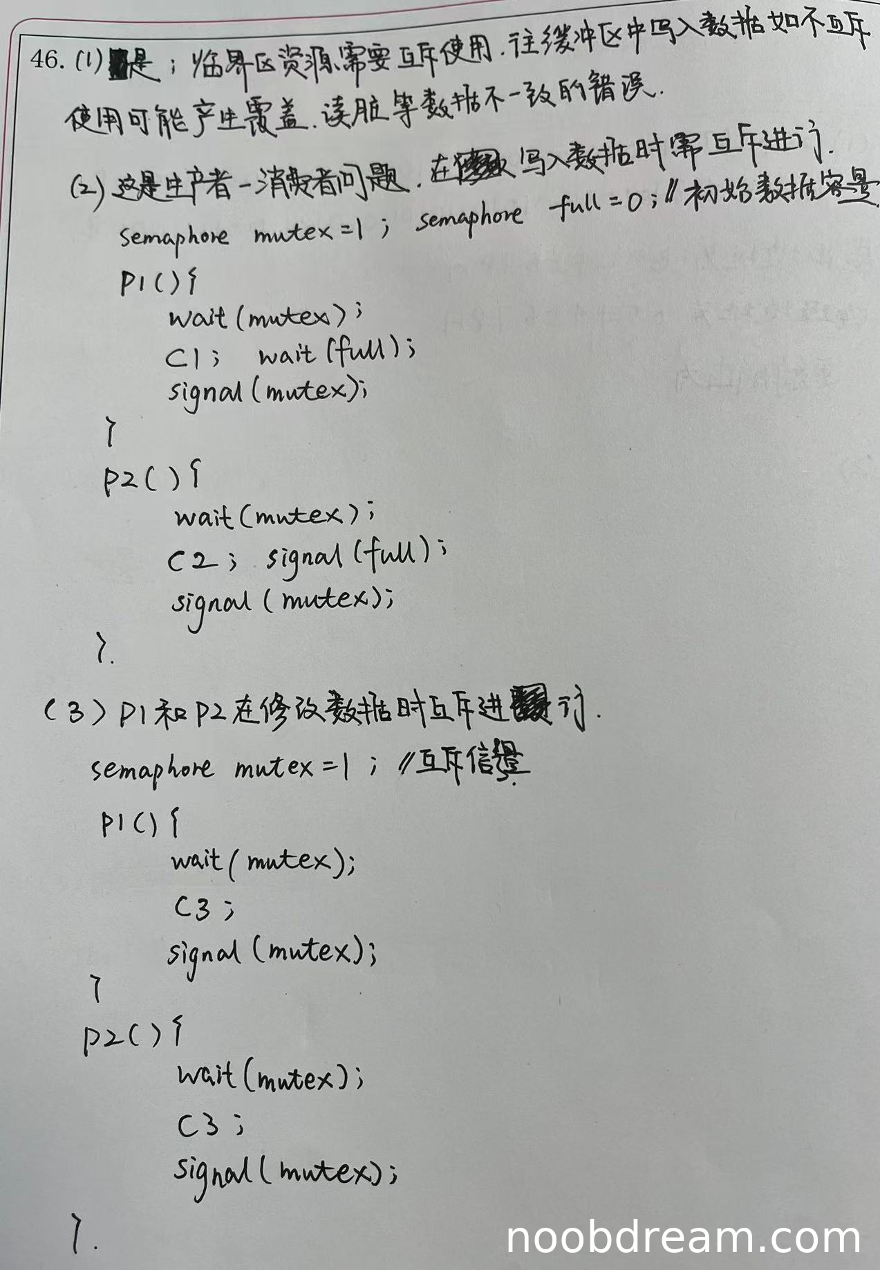学生识别出这是生产者-消费者问题,信号量定义正确(mutex=1,full=0)。但在代码实现中存在逻辑错误: