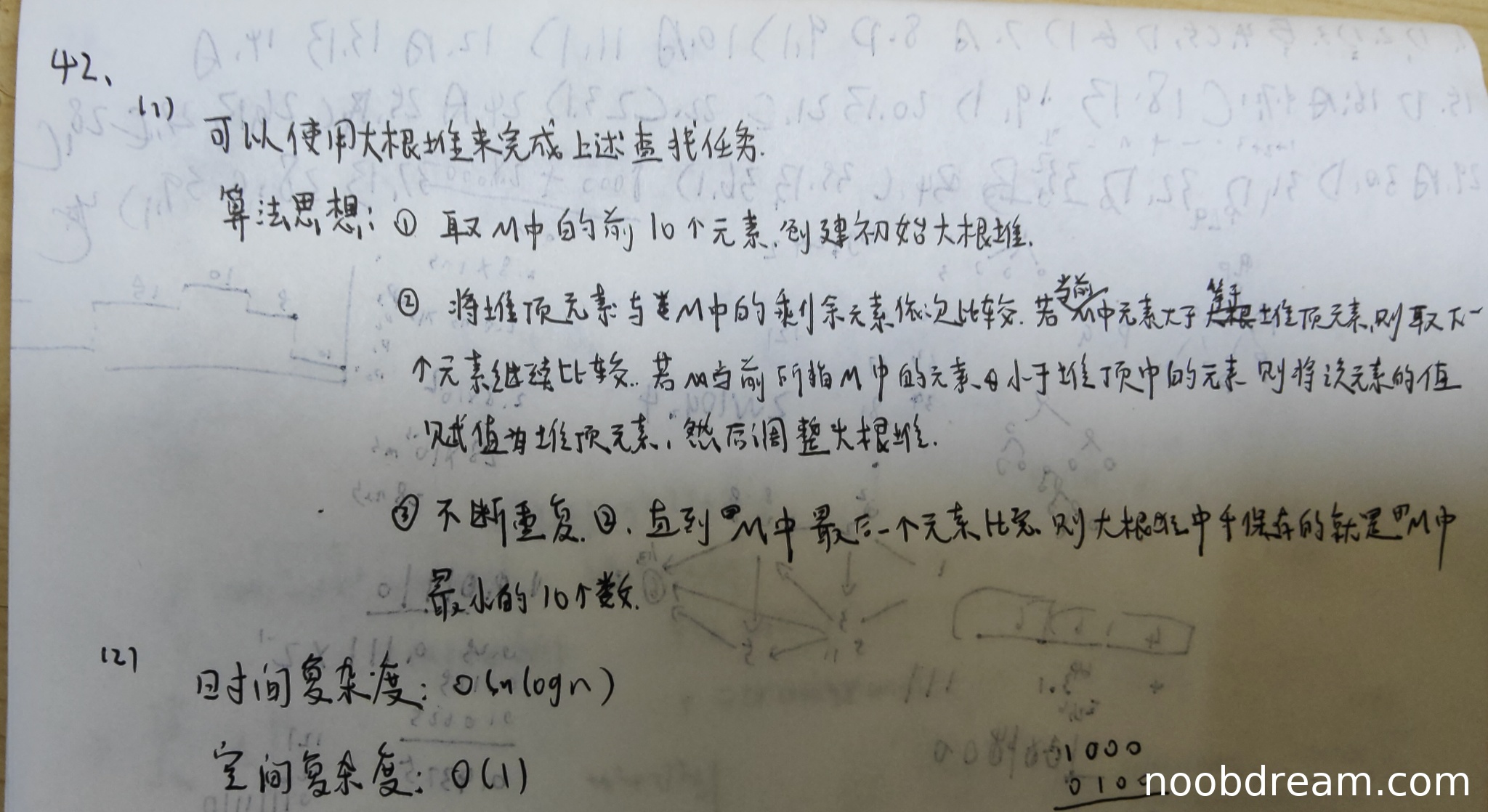 学生答案描述了大根堆算法思想,与标准答案方法二一致。算法步骤正确:先取前10个元素构建大根堆,然后遍历剩余元素,当元素小于堆顶时替换堆顶并调整堆。思路完整正确,得5分。