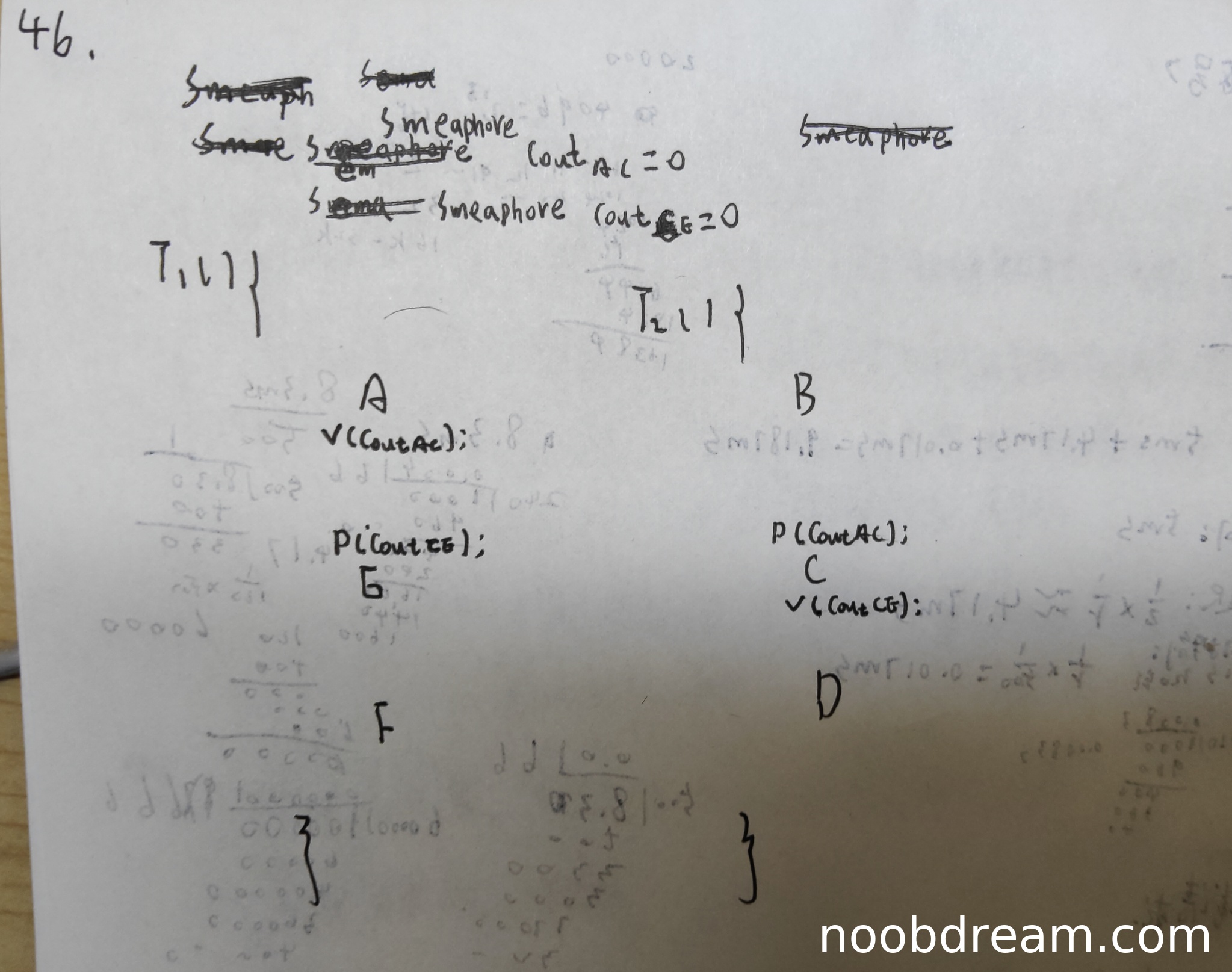 学生答案中T1执行A、B操作,但题目要求T1执行A、E、F操作,这里存在逻辑错误。T1中出现了B操作,且同步关系混乱。E和F操作完全缺失,C和D的同步关系也未正确处理。扣3分。