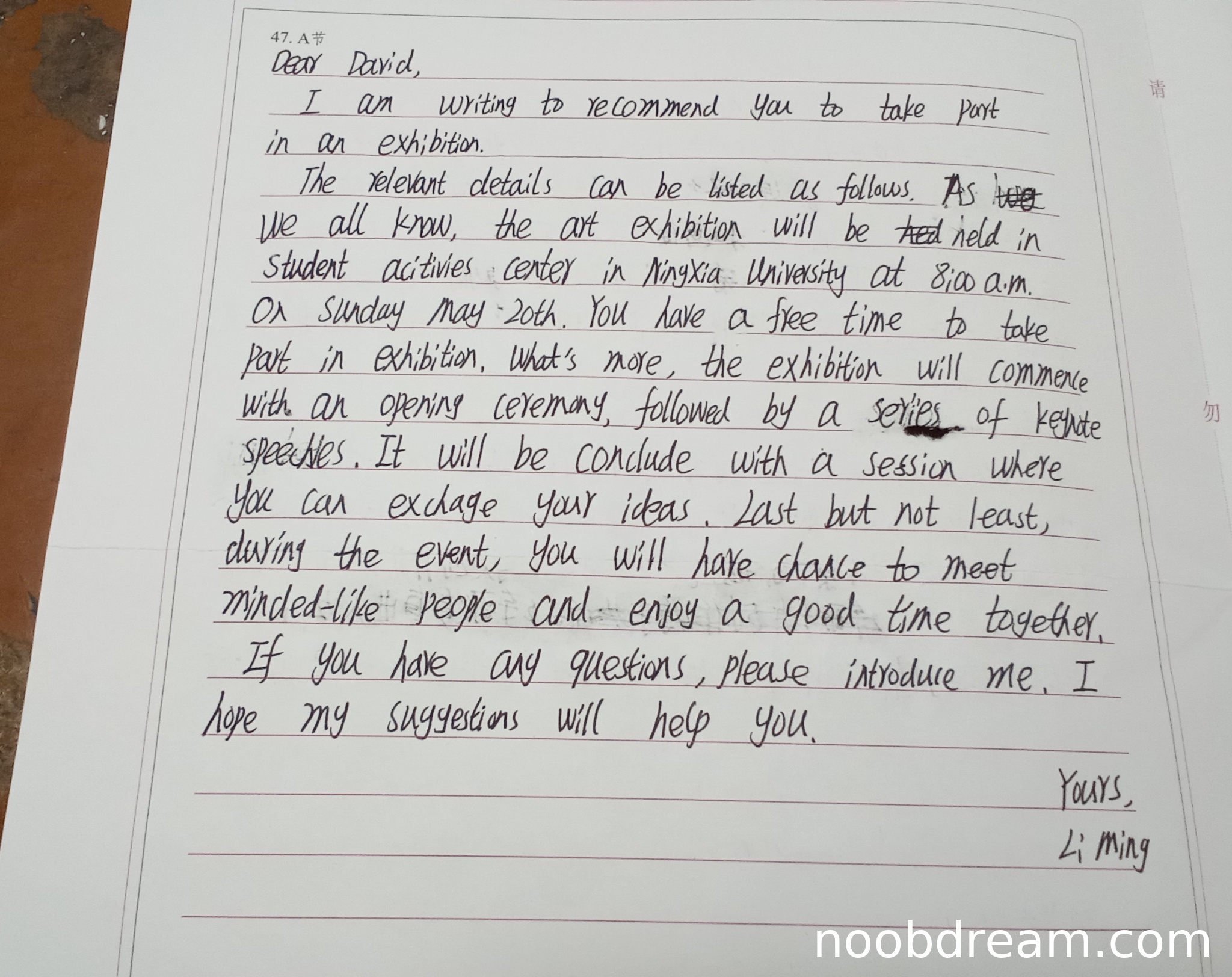 理由:语言基本通顺,但存在多处语法和用词错误,如"take part in an exhibition"未指明具体展览、"minded-like people"应为"like-minded people"、"please introduce me"应为"please contact me"等。虽然不影响基本理解,但错误较多。
