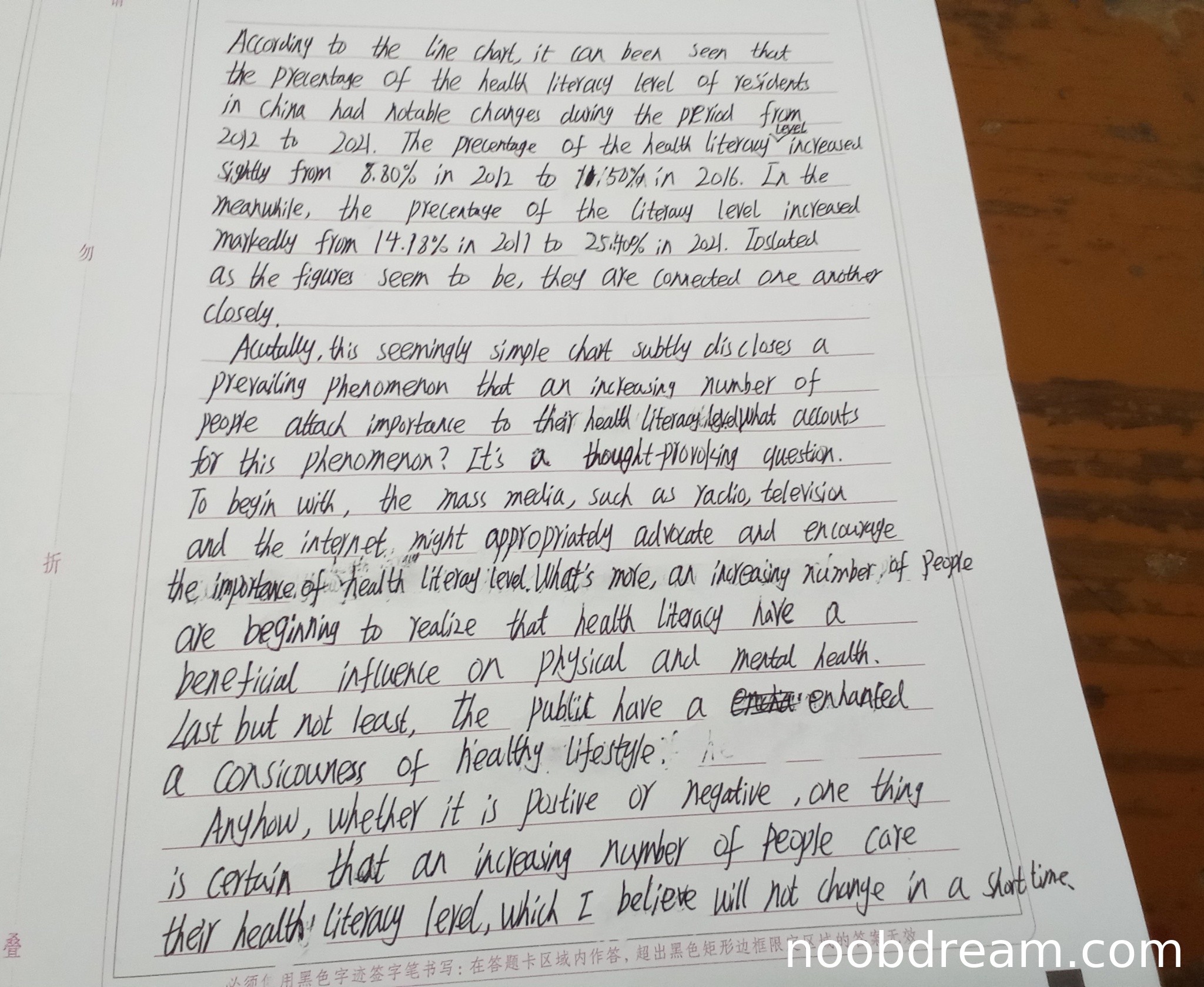 理由:学生基本完成了图表解读任务,描述了2012-2021年健康素养水平的变化趋势,但存在明显的数据错误。将2016年的数据误写为10.50%(应为11.58%),2017年数据误写为14.13%(应为14.18%),且未能准确描述2013-2015年的平缓增长阶段。评论部分提供了三个合理的原因,但数据准确性不足影响了内容要点的完整性。