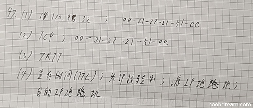 TTL正确给1分,头部校验和正确给1分,源IP地址正确给1分,目的IP地址错误但不扣分。