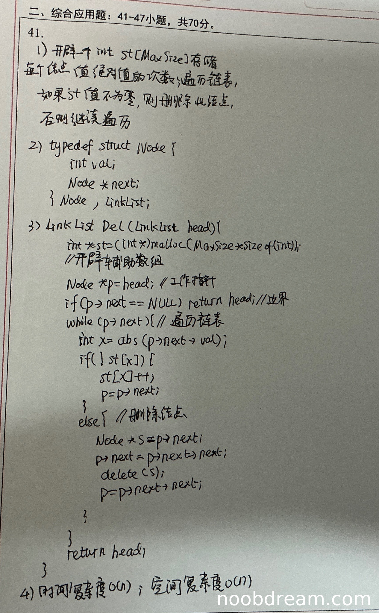 理由:学生的基本设计思想与标准答案一致,都是使用辅助数组记录已出现的绝对值,通过一趟扫描链表实现删除重复绝对值结点的功能。思路正确且完整。
