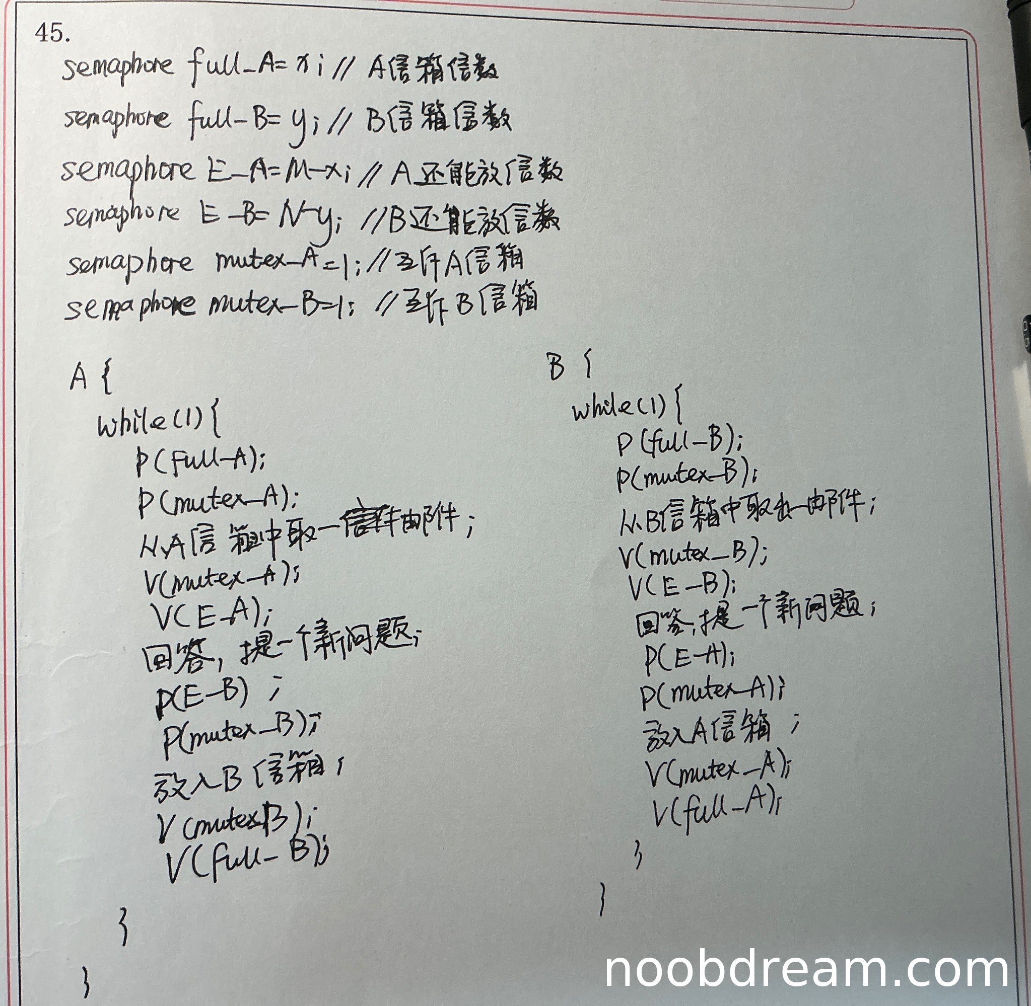 (2)A进程同步互斥操作(满分3分)