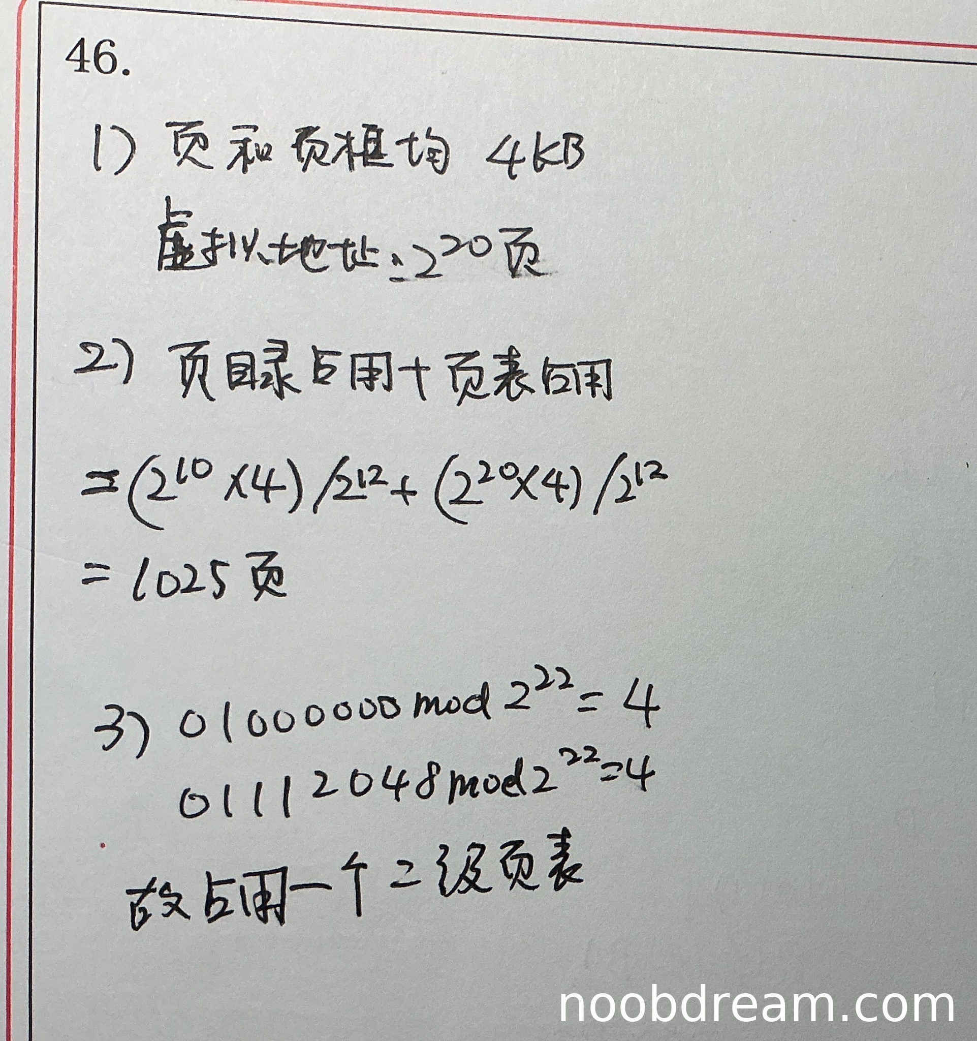 学生通过计算两个虚拟地址模2^22得到相同的值4,判断它们属于同一个二级页表(即页目录号相同),这与标准答案的思路一致。虽然表达方式不同(标准答案直接比较最高10位,学生用模运算),但逻辑正确且结论一致,得2分。