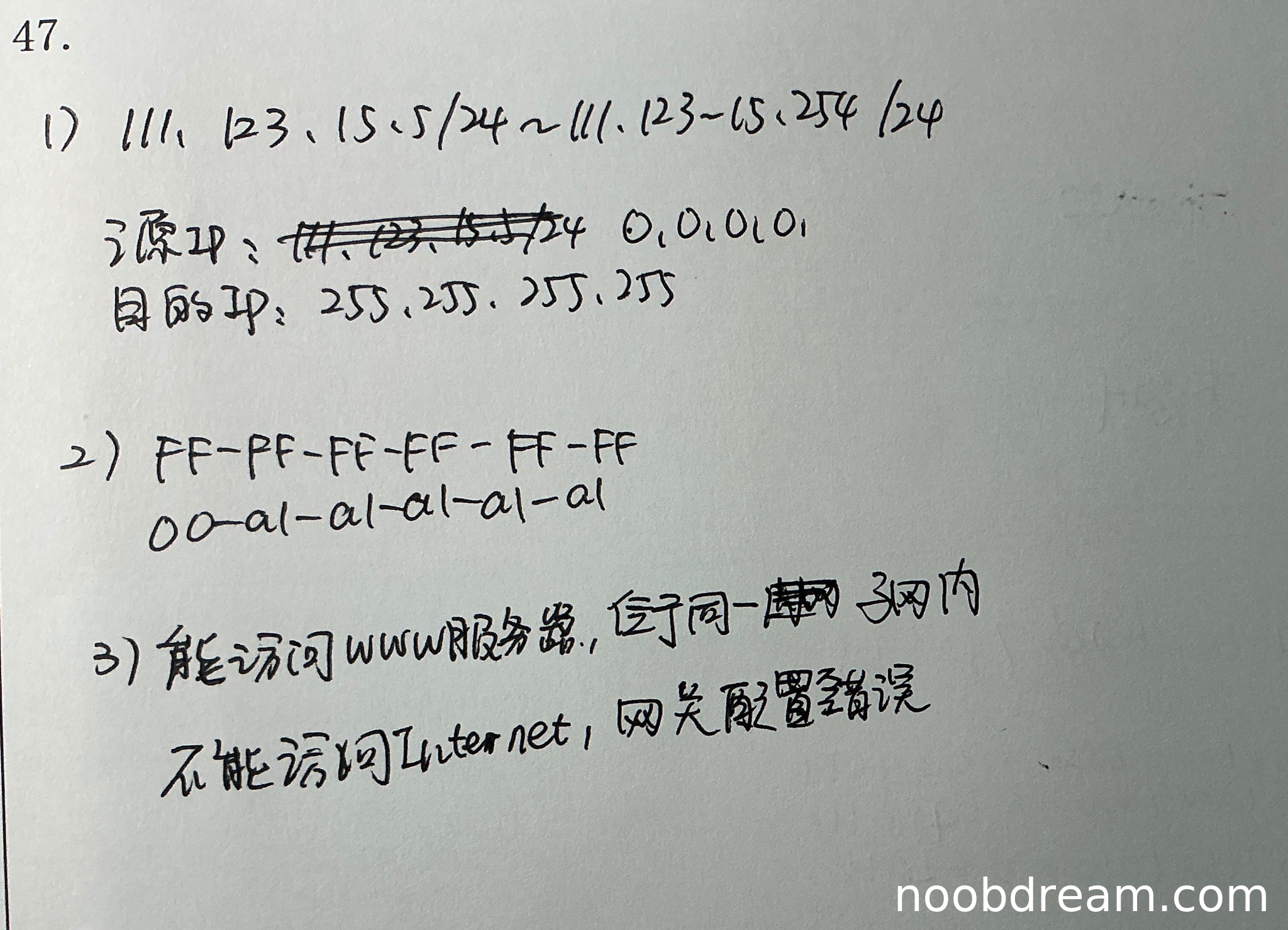 理由:第一个以太网帧目的MAC地址"FF-FF-FF-FF-FF-FF"完全正确,封装IP分组的以太网帧目的MAC地址"00-a1-a1-a1-a1-a1"也完全正确,与标准答案一致。