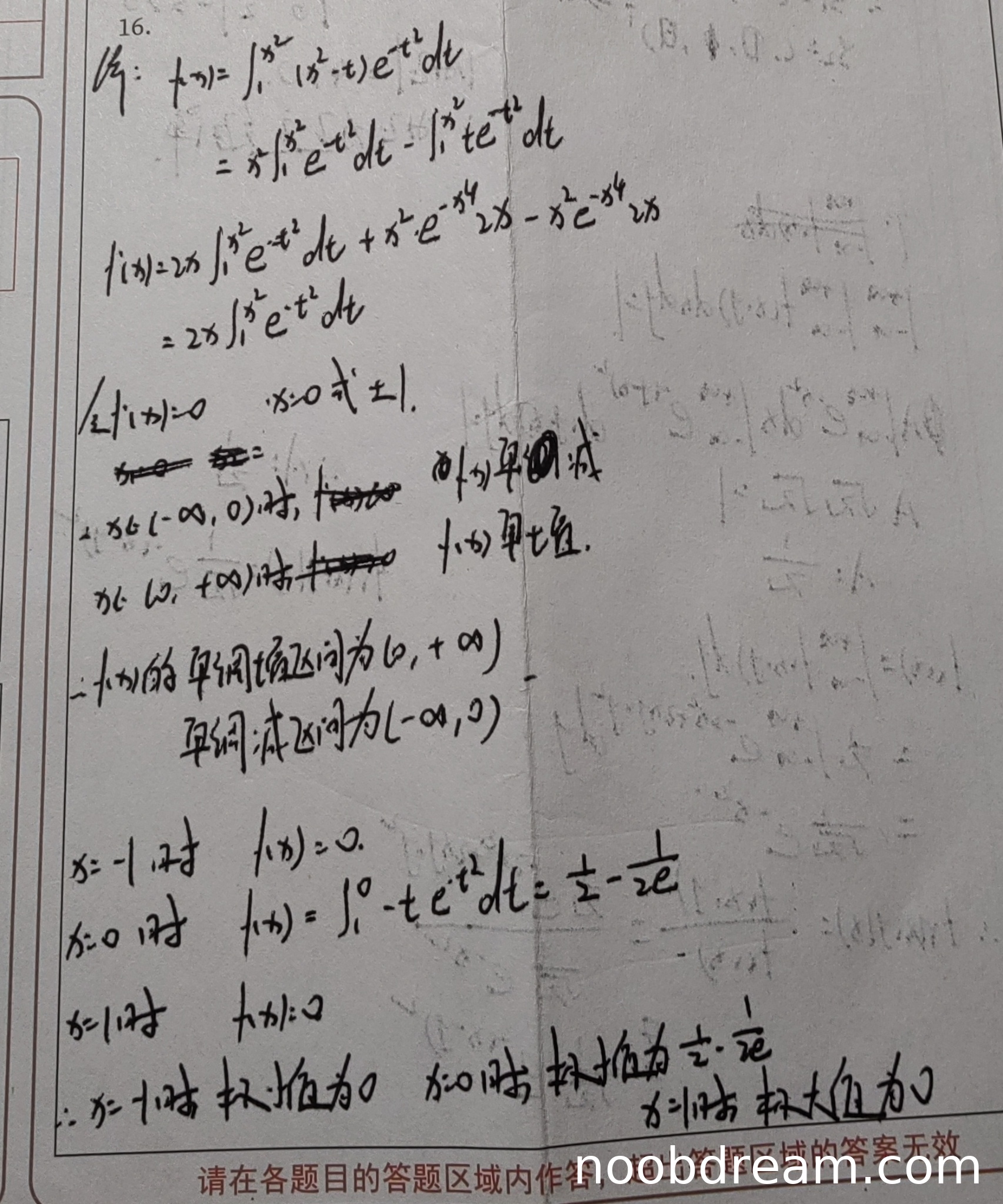 学生正确求导得到 \( f'(x) = 2x \int_{1}^{x^2} e^{-t^2} dt \),并正确解出驻点 \( x = 0, \pm 1 \)。但在单调性分析中存在逻辑错误: