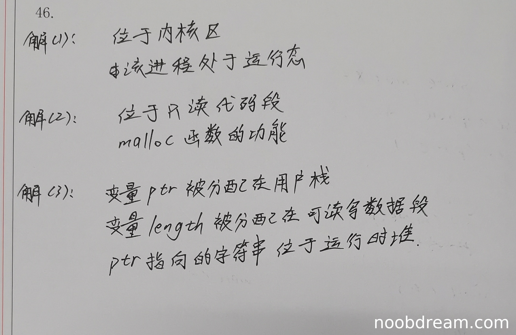 学生回答"变量ptr被分配在用户栈"错误,ptr是全局变量应分配在可读写数据段,扣1分;回答"变量length被分配在可读写数据段"错误,length是局部变量应分配在用户栈,扣1分;回答"ptr指向的字符串位于运行时堆"正确,得1分。因此本小题得1分。