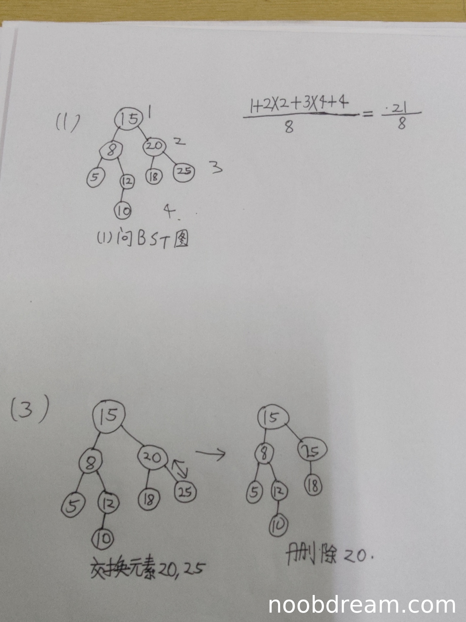 学生提到"交换元素20,25,删除20",符合BST删除非叶子节点的中序后继替换法思路,但未完整说明删除过程(如未明确说明25是20的中序后继节点)且未提供删除后的树形结构,扣2分。本小题得1分。