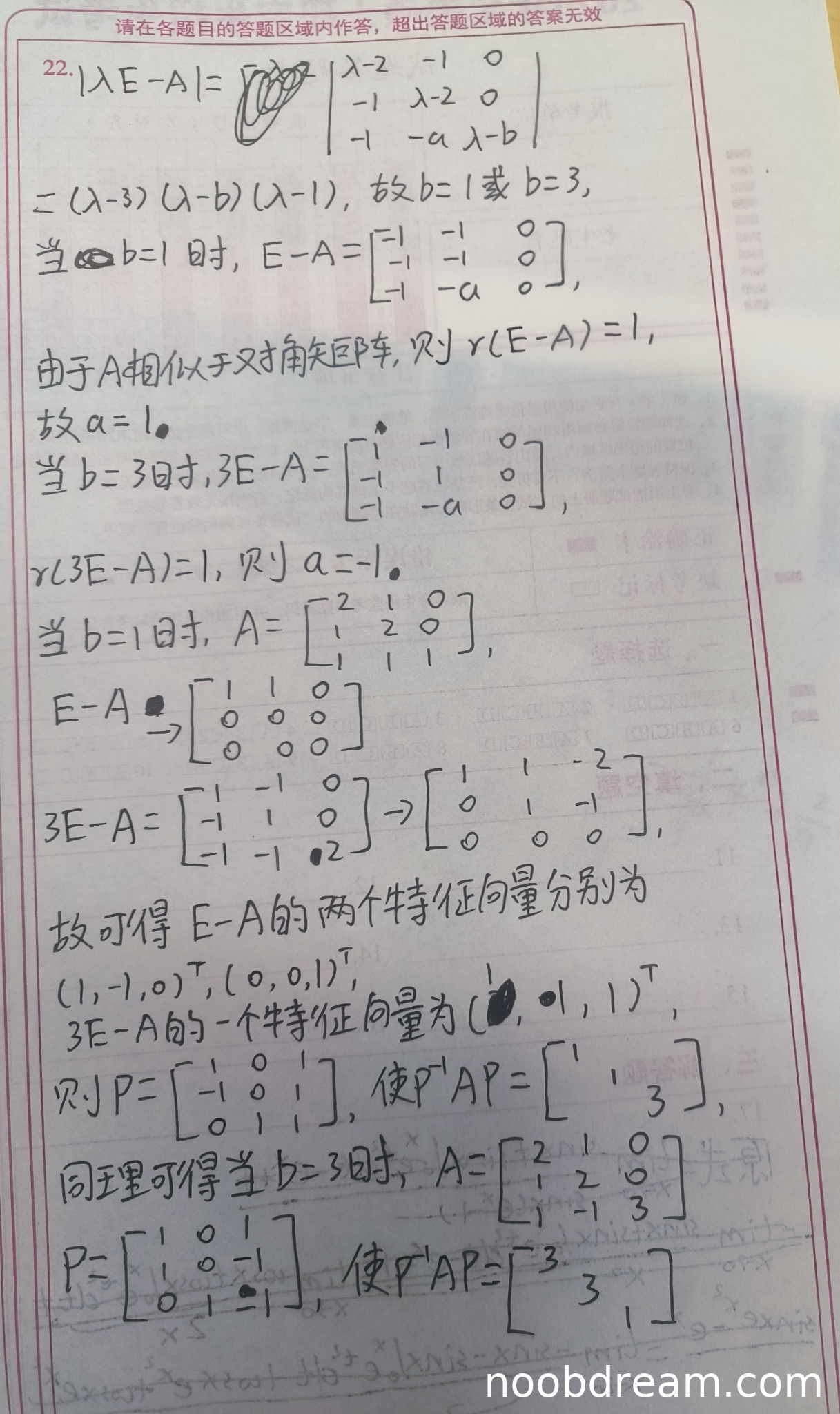 理由:学生正确计算了特征多项式,得出特征值为1,3,b,并正确分析出b=1或3时满足仅有两个不同特征值。在b=1时通过秩的条件正确求出a=1;在b=3时通过秩的条件正确求出a=-1。这部分解答完整正确。
