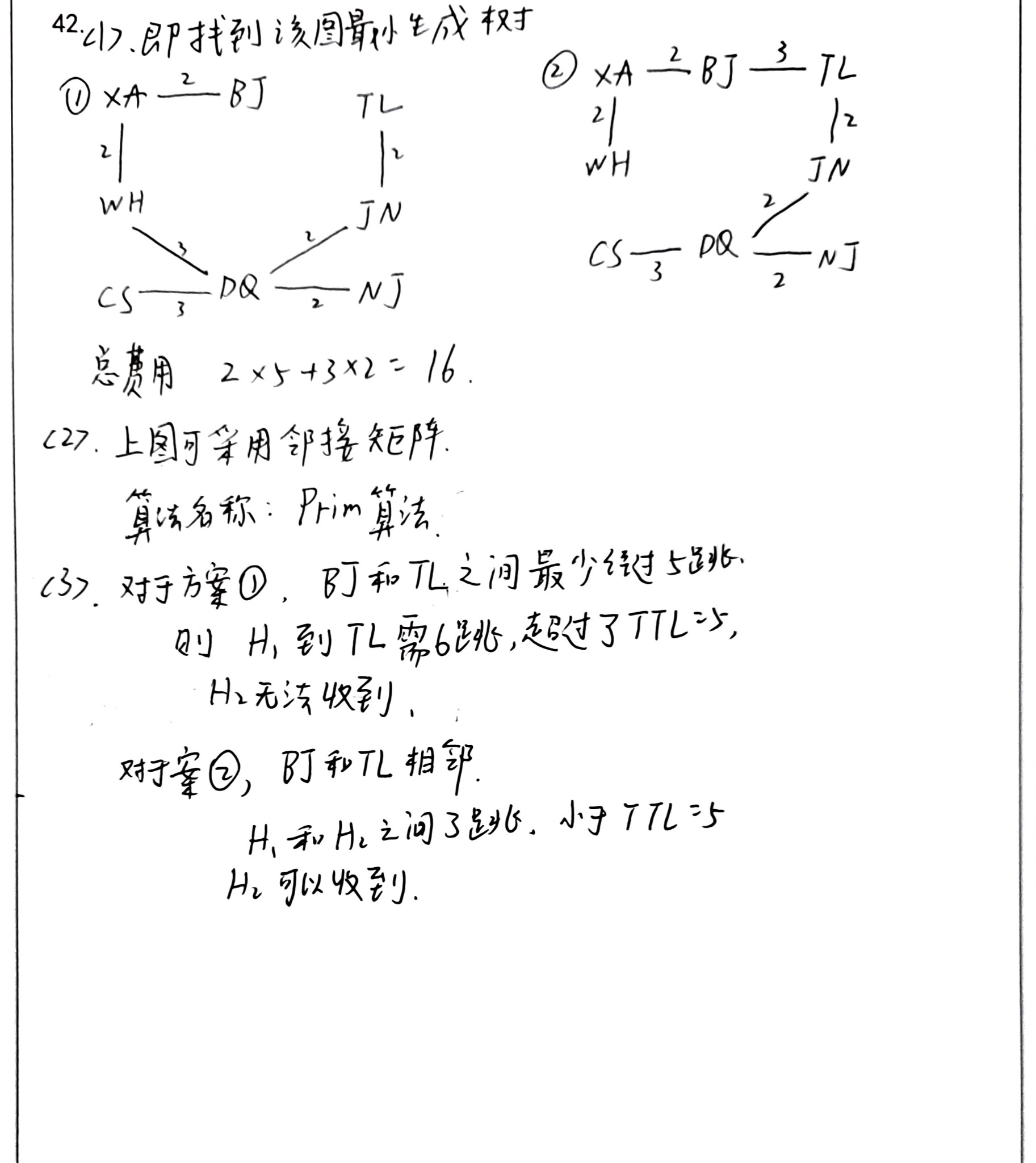 学生正确识别了问题为求最小生成树,并给出了两种方案,总费用计算正确为16。方案一的边列表形式为:(XA,BJ,2), (XA,WH,2), (TL,JN,2), (JN,QD,2), (NJ,QD,2), (WH,QD,3), (CS,QD,3);方案二的边列表形式为:(XA,BJ,2), (XA,WH,2), (BJ,TL,3), (TL,JN,2), (JN,QD,2), (NJ,QD,2), (CS,QD,3)。两种方案均正确,总费用计算无误。得4分。