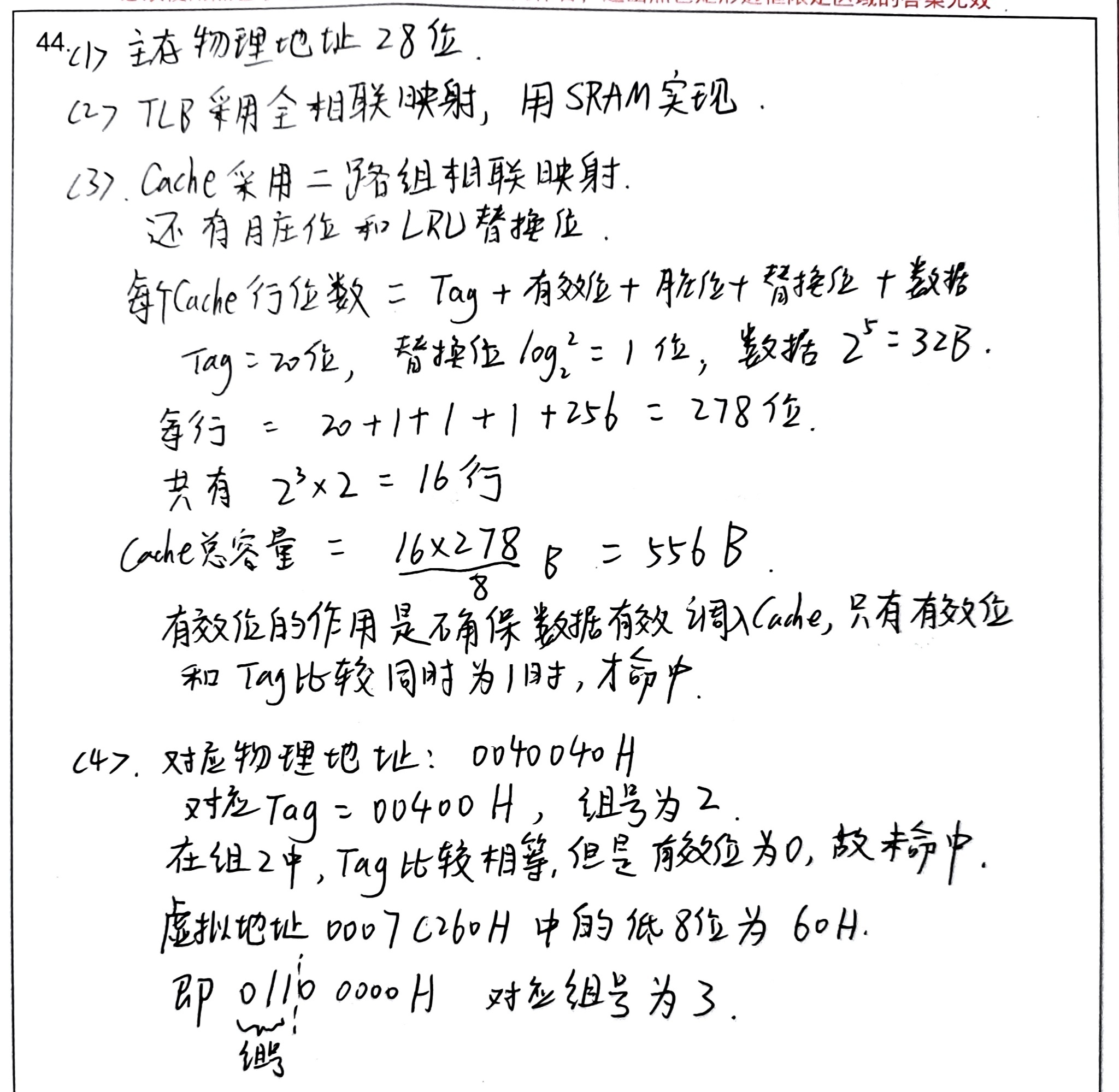 学生正确给出物理地址0040040H(1分),并正确判断未命中,理由为Tag匹配但有效位为0(2分)。在计算组号时,学生正确得出组号为3(2分),但虚拟地址0007C260H的低12位分析中,学生提到低8位为60H,实际应为低12位,但最终组号计算正确,可能是表述不严谨,不扣分。得5分。