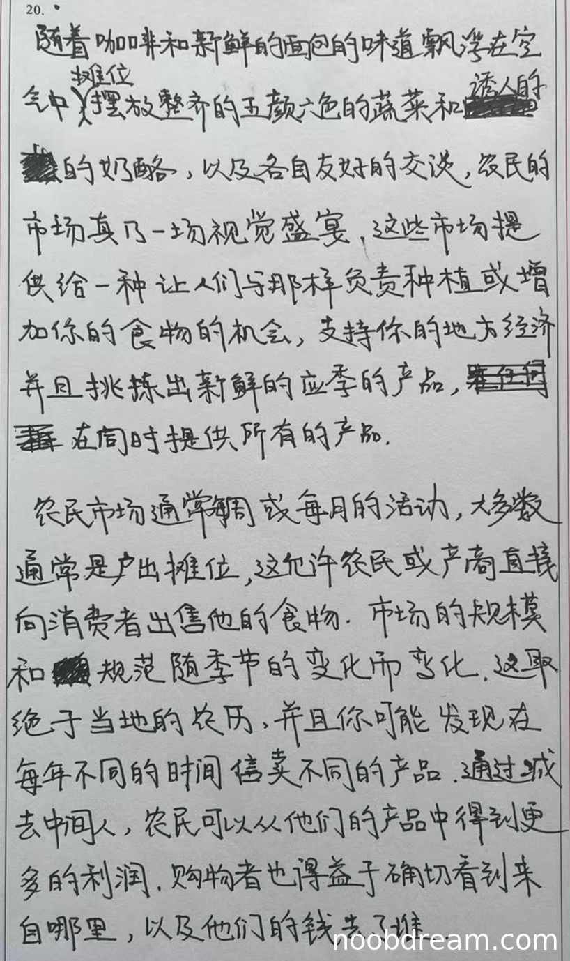 学生翻译基本传达了原文第一句的意思,但存在以下问题:"农民的市场"应为"农贸市场";"视觉盛宴"不准确,原文是"feast for the senses"(感官盛宴);"摆放整齐"为多余添加;"各自友好的交谈"表达不够通顺。考虑到核心意思基本传达,但有多处表达不准确,扣1分,得2分。