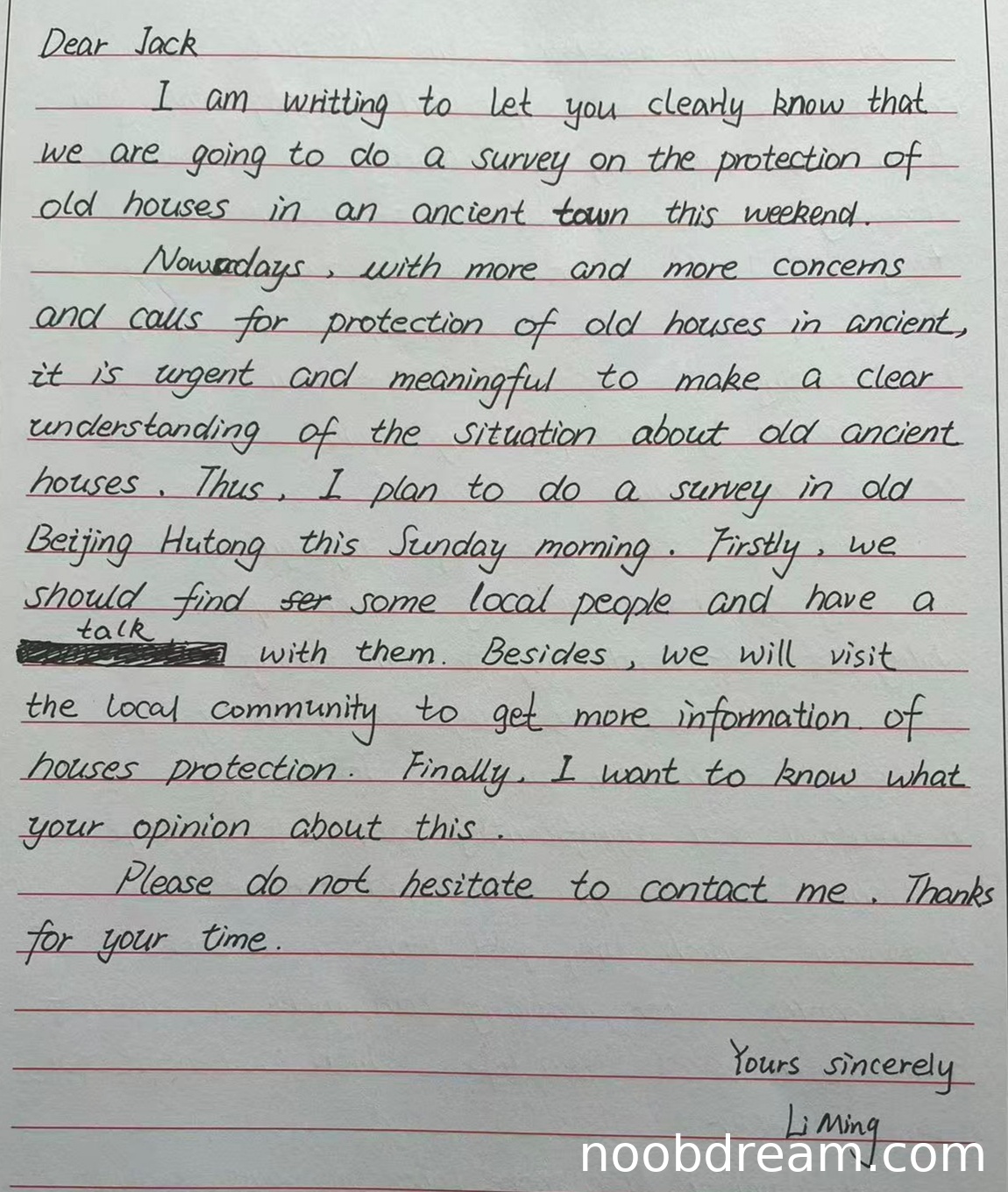 理由:内容基本覆盖了题目要求的两个要点:提出计划(在旧北京胡同做调查,与当地人交谈,访问社区)和征求对方意见。但计划部分略显笼统,缺少具体细节(如调查方法、问卷设计等),属于次要要点遗漏。