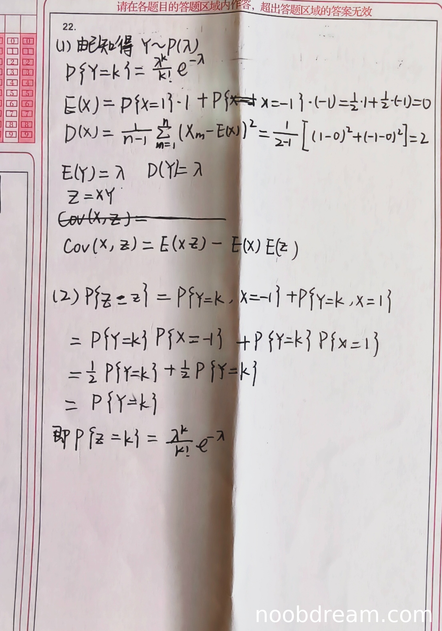 学生作答中,计算协方差的部分思路正确,使用了公式 \(Cov(X,Z)=E(XZ)-E(X)E(Z)\),并正确得到 \(E(X)=0\)。但后续计算错误:学生没有正确计算 \(E(XZ)\),而是错误地计算了方差 \(D(X)\)(且方差公式使用错误,这里不应使用样本方差公式),导致没有得出正确答案 \(\lambda\)。核心逻辑错误在于未能利用独立性正确计算 \(E(XZ)=E(X^2Y)=E(X^2)E(Y)\)。因此扣分。得分:2分(思路部分正确,但关键计算错误)。