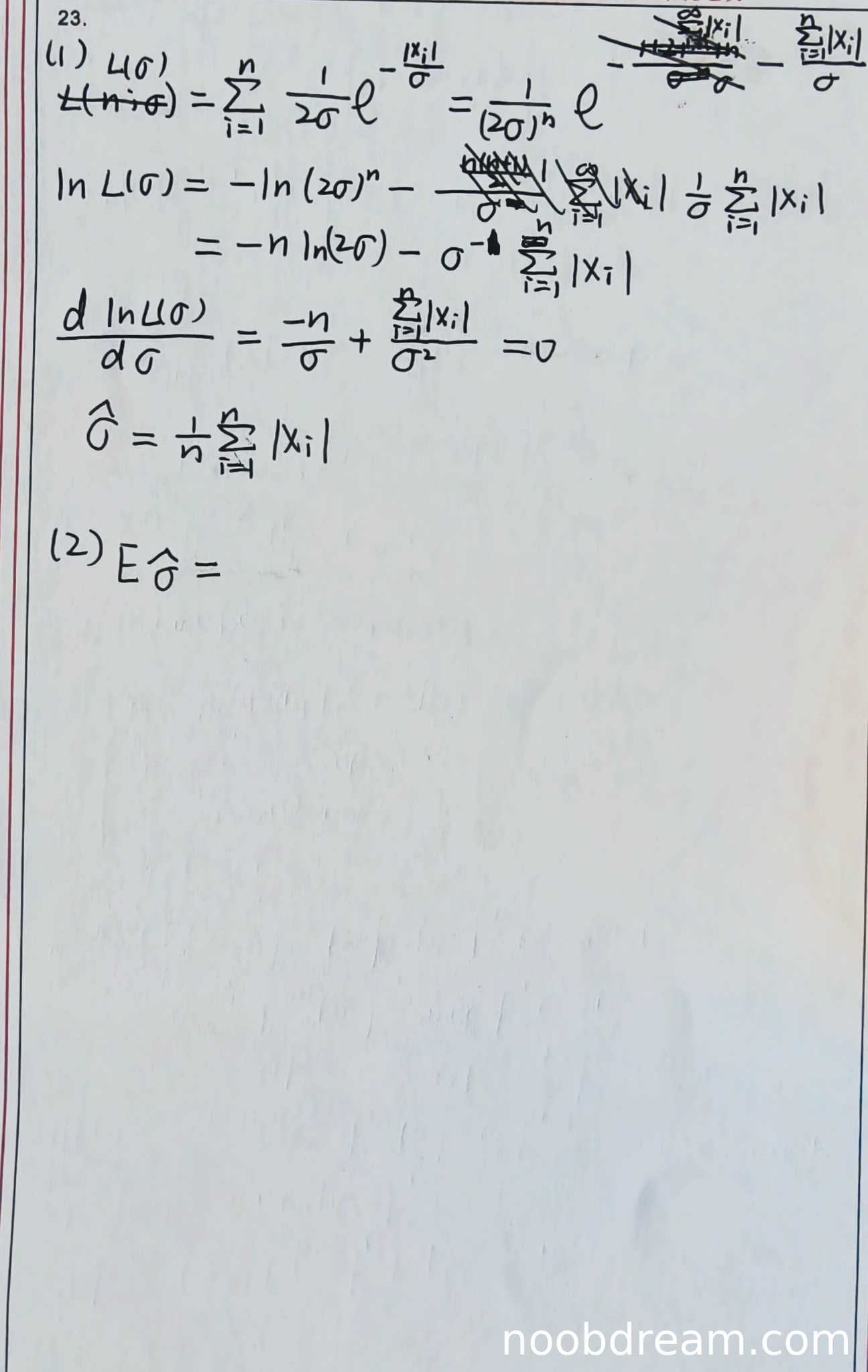 学生作答中,第一次识别结果在似然函数表示上存在错误:将连乘符号误写为求和符号,即写成了 \(L(\sigma)=\sum_{i = 1}^{n}\frac{1}{2\sigma}e^{-\frac{|x_{i}|}{\sigma}}\),这属于逻辑错误。但后续的对数似然函数推导、求导过程以及最终的最大似然估计量 \(\hat{\sigma}=\frac{1}{n}\sum_{i = 1}^{n}|x_{i}|\) 均正确。第二次识别结果中,似然函数已正确表示为连乘形式(尽管仍使用求和符号,但结合上下文和最终结果,可判断为识别错误,不扣分),且后续步骤正确。因此,核心逻辑正确,但第一次识别中的符号错误需扣1分。本小题满分6分,扣1分后得5分。