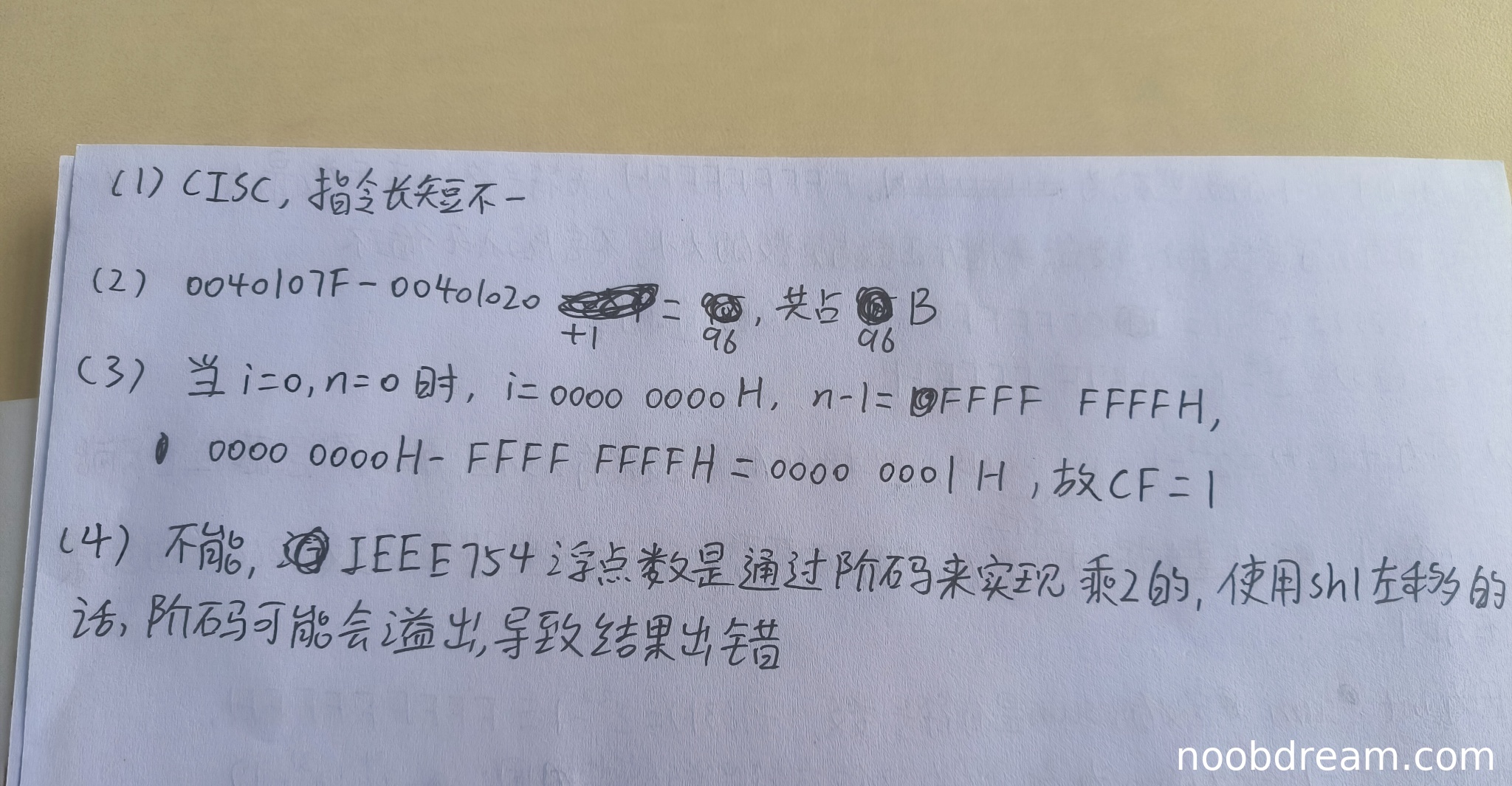 学生回答“当i=0,n=0时,i=0000 0000H,n-1=FFFF FFFFH, 0000 0000H - FFFF FFFFH = 0000 0001H,故CF=1”,结果正确,但未详细说明CF的计算过程(如补码减法转换为加法、进位标志C的取值及CF=C⊕1的关系)。标准答案要求给出计算过程,此处过程不够完整。扣1分。得2分。
