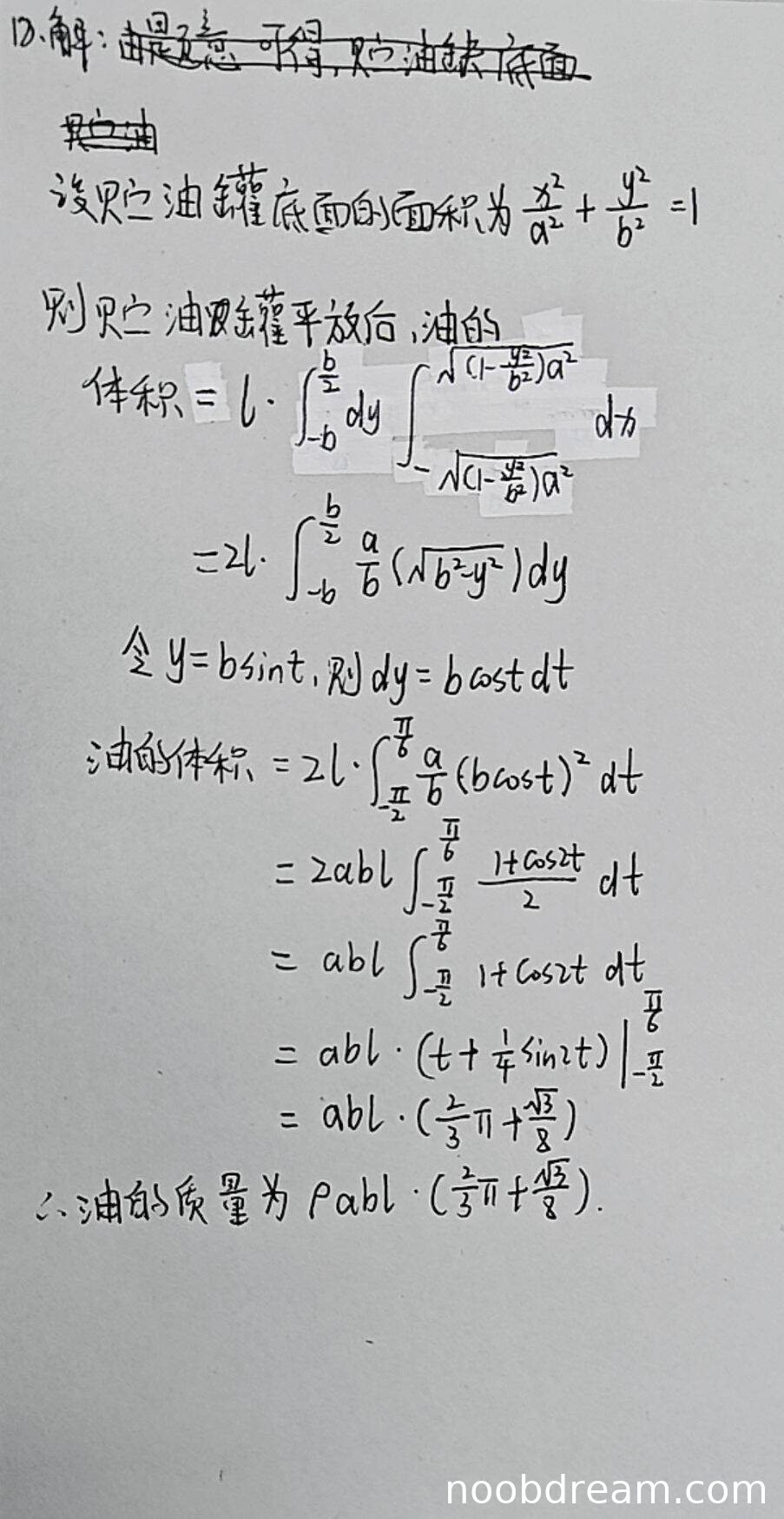 学生作答的整体思路正确:建立了正确的坐标系,底面椭圆方程正确,积分上下限正确(y从-b到b/2),积分表达式正确(对x积分后得到2a/b*sqrt(b^2-y^2)),换元法正确(令y=bsint),积分区间变换正确(t从-π/2到π/6)。