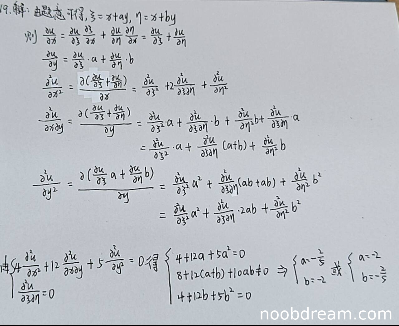 学生作答在两次识别中均正确计算了偏导数的变换过程,并建立了正确的方程组。第一次识别中,学生正确列出了三个条件:4+12a+5a²=0、4+12b+5b²=0、8+12(a+b)+10ab≠0,并正确解出了a,b的两组解(-2,-2/5)和(-2/5,-2)。第二次识别中虽然第三个条件写成了等于0,但从后续解答看实际是按不等于0处理的。