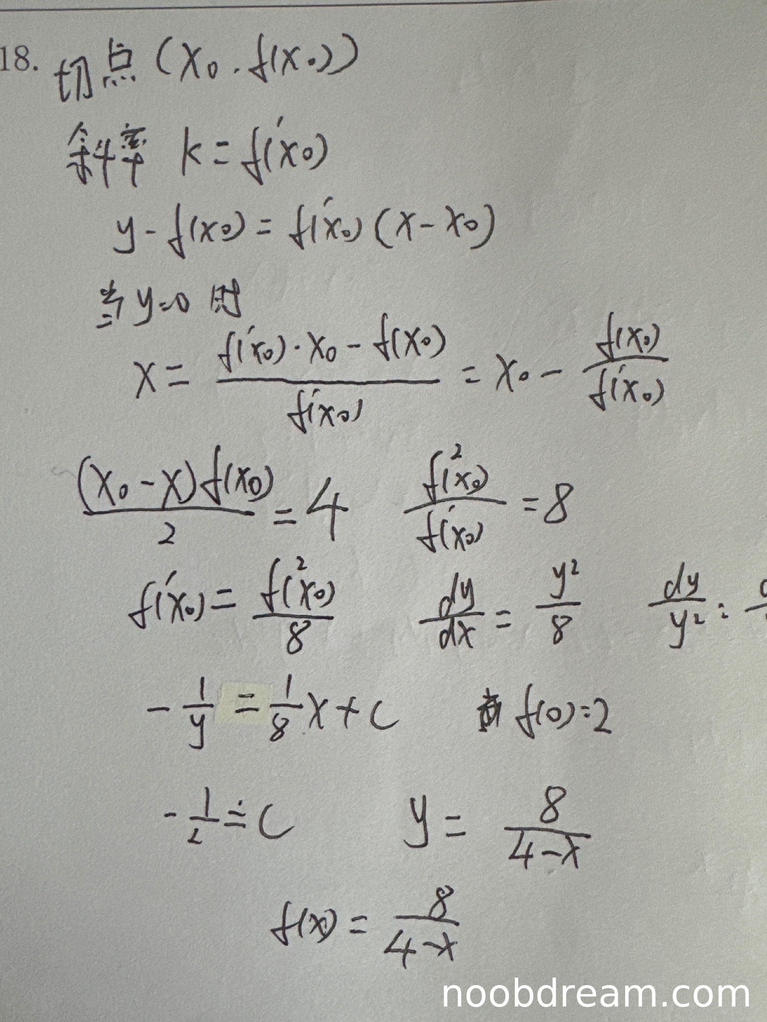 学生作答在整体思路上与标准答案一致,具体步骤包括:正确写出切线方程,求出切线与x轴交点横坐标,利用面积条件建立方程,推导出微分方程,分离变量求解微分方程,并利用初始条件确定常数,最终得到函数表达式。每一步逻辑清晰,计算正确。