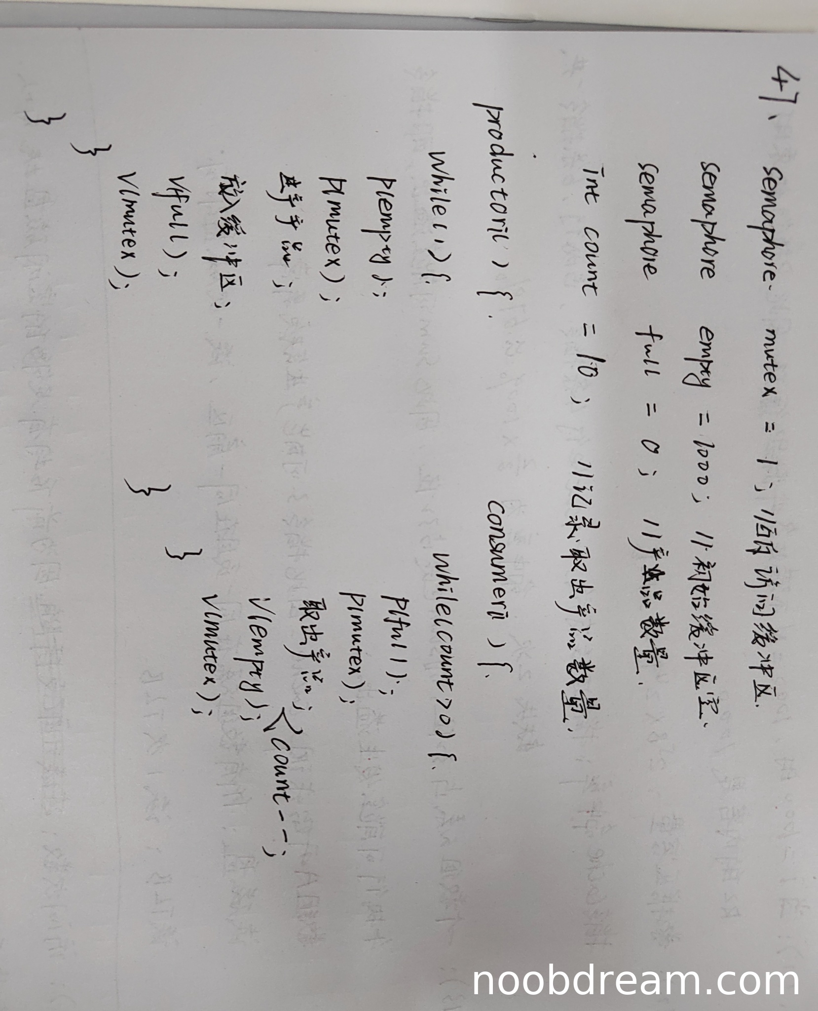 理由:存在多个逻辑错误:①消费者使用count>0作为循环条件,这会导致每个消费者只能取10次后就退出,不符合题目要求;②缺少控制连续取10件的互斥机制;③count变量作为全局变量使用,没有保护机制,会导致竞态条件;④消费者进程结构不完整。但基本的同步互斥操作顺序正确,给1分。