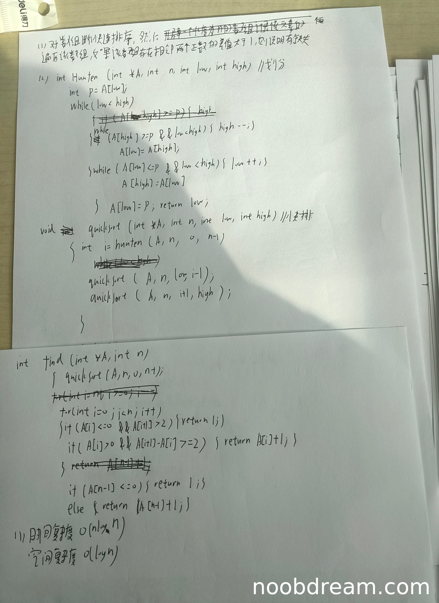 学生给出的基本设计思想是:先对数组进行快速排序,然后遍历数组寻找相邻正数差值大于1的位置来确定未出现的最小正整数。这种思路虽然可行,但并不是时间上尽可能高效的算法(题目要求时间上尽可能高效)。标准答案使用了O(n)时间复杂度的原地哈希方法,而学生的排序方法需要O(n log n)时间复杂度,效率较低。不过思路本身是正确的,只是不够高效。扣1分。