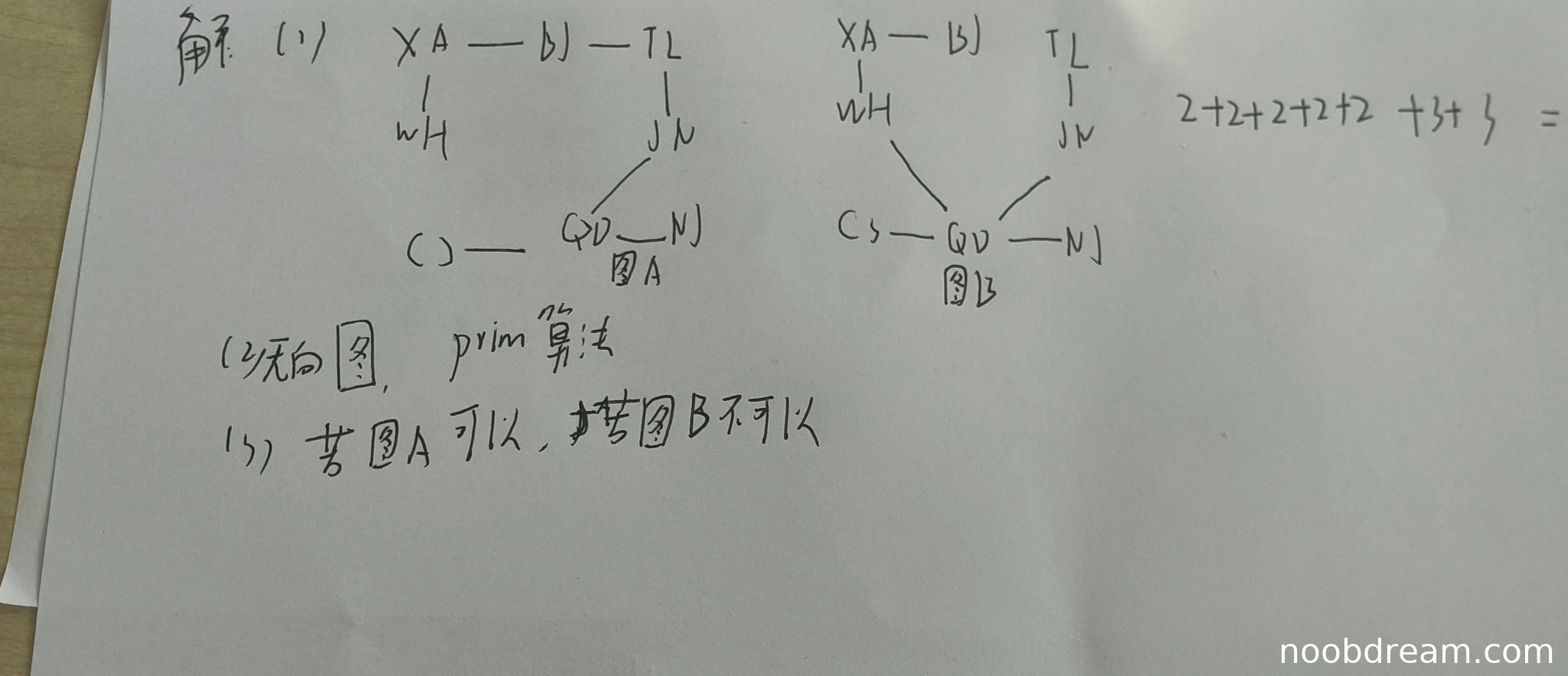 学生给出了两个方案(图A和图B),但两个方案的结构描述相同,且未明确标注边的权重。从描述中无法判断是否是最小生成树,也未计算总费用。标准答案要求给出所有可能的最经济方案(两种)并计算总费用(16),学生未完整满足要求。因此扣2分,得2分。