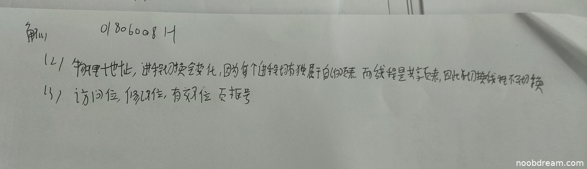 第一问回答"物理地址"正确,得1分;第二问回答"进程切换会变化"正确,理由"每个进程拥有独属于自己的页表"基本正确,得1分;第三问回答"切换线程不切换"正确,理由"线程是共享页表"基本正确,得1分。但学生未明确说明PDBR保存的是页目录起始地址这一关键点,扣0.5分;线程切换部分表述不够严谨,扣0.5分。本小题共得3分。