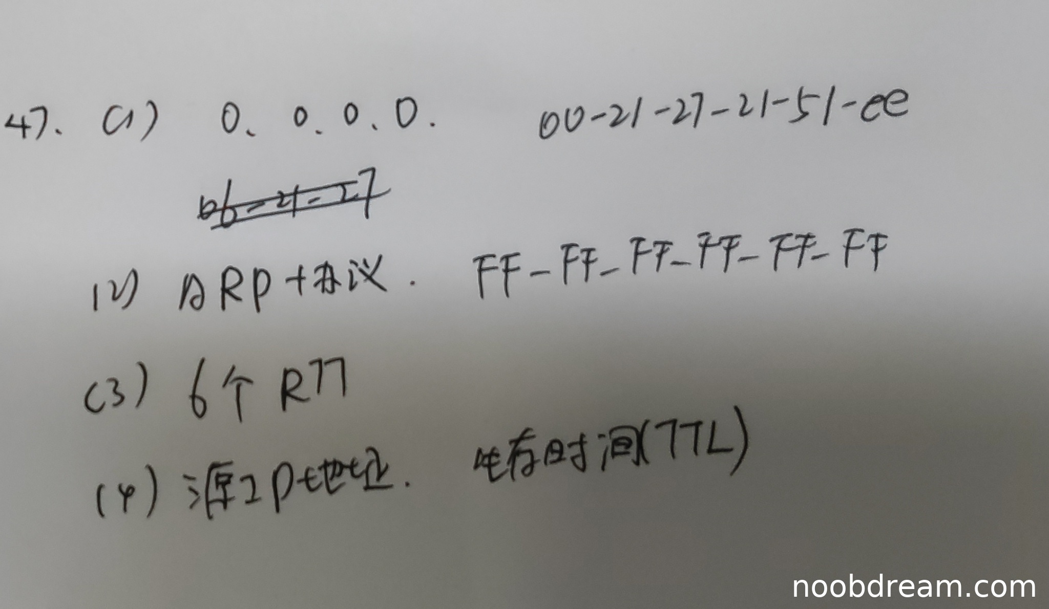 第二问:学生正确回答ARP请求报文的目的MAC地址为"FF-FF-FF-FF-FF-FF",得1分。