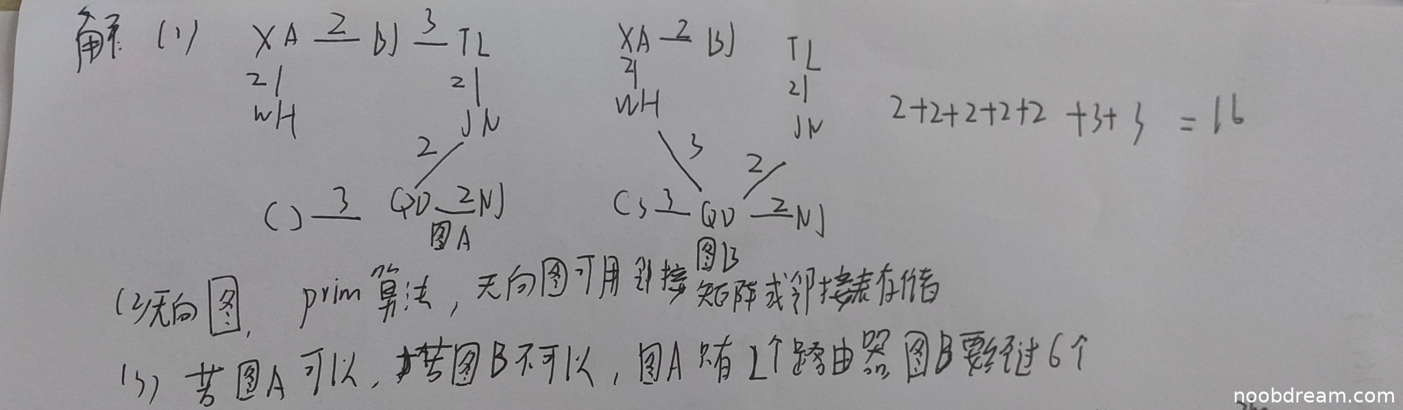 学生给出了总费用16,与标准答案一致,但未给出具体的边列表或图示表示两种最小生成树方案。由于题目要求"给出所有可能的最经济的光缆铺设方案(用带权图表示)",学生仅计算了总费用,未完整展示方案,因此扣2分。得2分。