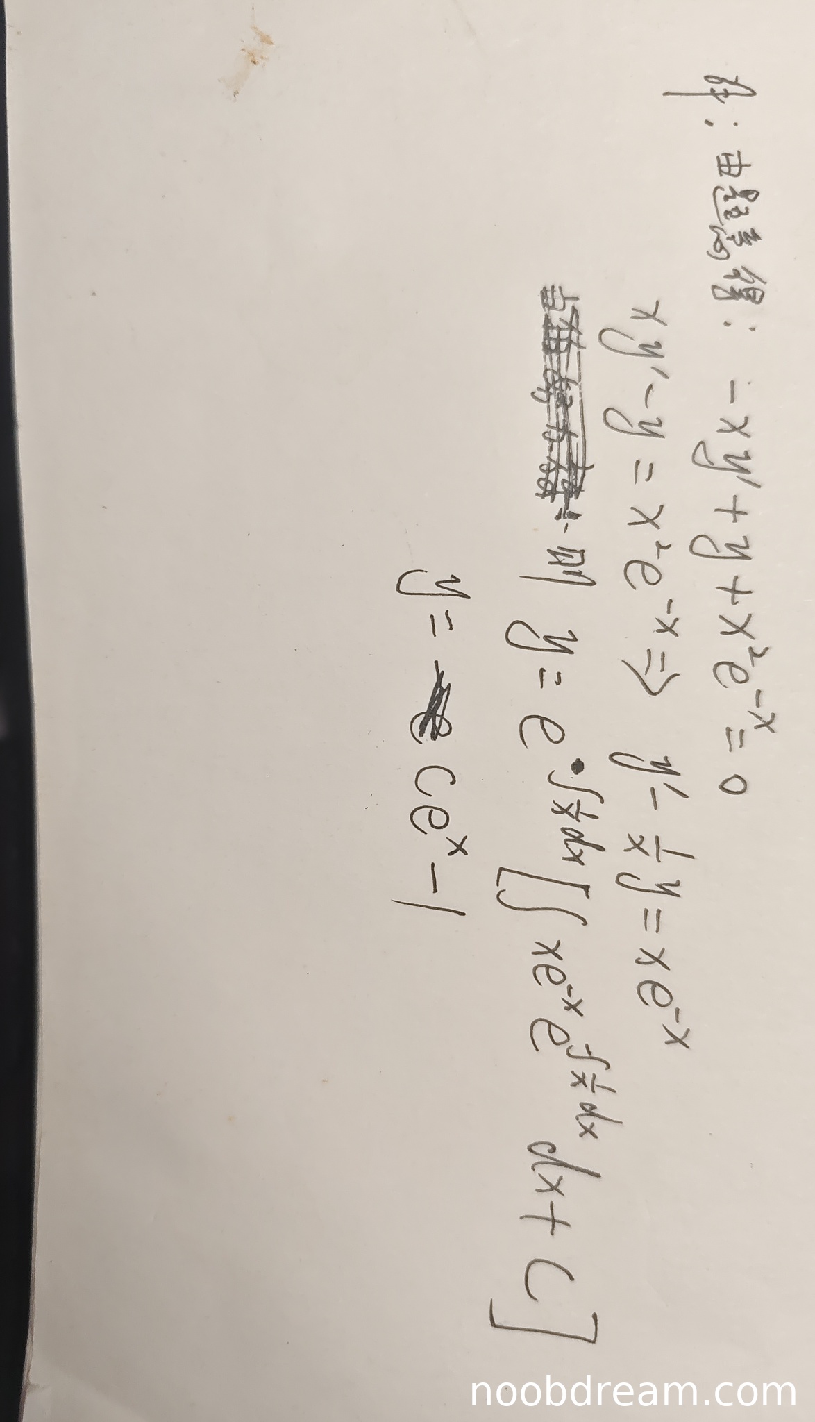 - 计算过程:\(e^{\int P(x)dx} = e^{\int -\frac{1}{x}dx} = e^{-\ln x} = \frac{1}{x}\),但学生写成了 \(e^{\ln x} = x\),这是错误的,应为 \(e^{\int -\frac{1}{x}dx} = e^{-\ln x} = \frac{1}{x}\)。然而,在后续计算中,学生写的是 \(y = e^{\ln x}[\int xe^{-x}e^{-\ln x}dx + c]\),这里 \(e^{\ln x} = x\) 对应的是 \(e^{\int \frac{1}{x}dx}\),但标准形式中应是 \(e^{\int P(x)dx}\),而 \(P(x) = -\frac{1}{x}\),所以应为 \(e^{-\ln x} = \frac{1}{x}\)。学生此处符号错误,但巧合的是,在公式应用中,学生实际使用了 \(e^{\int \frac{1}{x}dx}\)(即 \(x\))作为积分因子,这对应于将方程写为 \((xy)' = x^2 e^{-x}\) 的形式,这是一种正确的解法。后续计算 \(\int e^{-x}dx = -e^{-x} + c\) 正确,最终得到 \(y = -xe^{-x} + cx\),与标准答案一致。