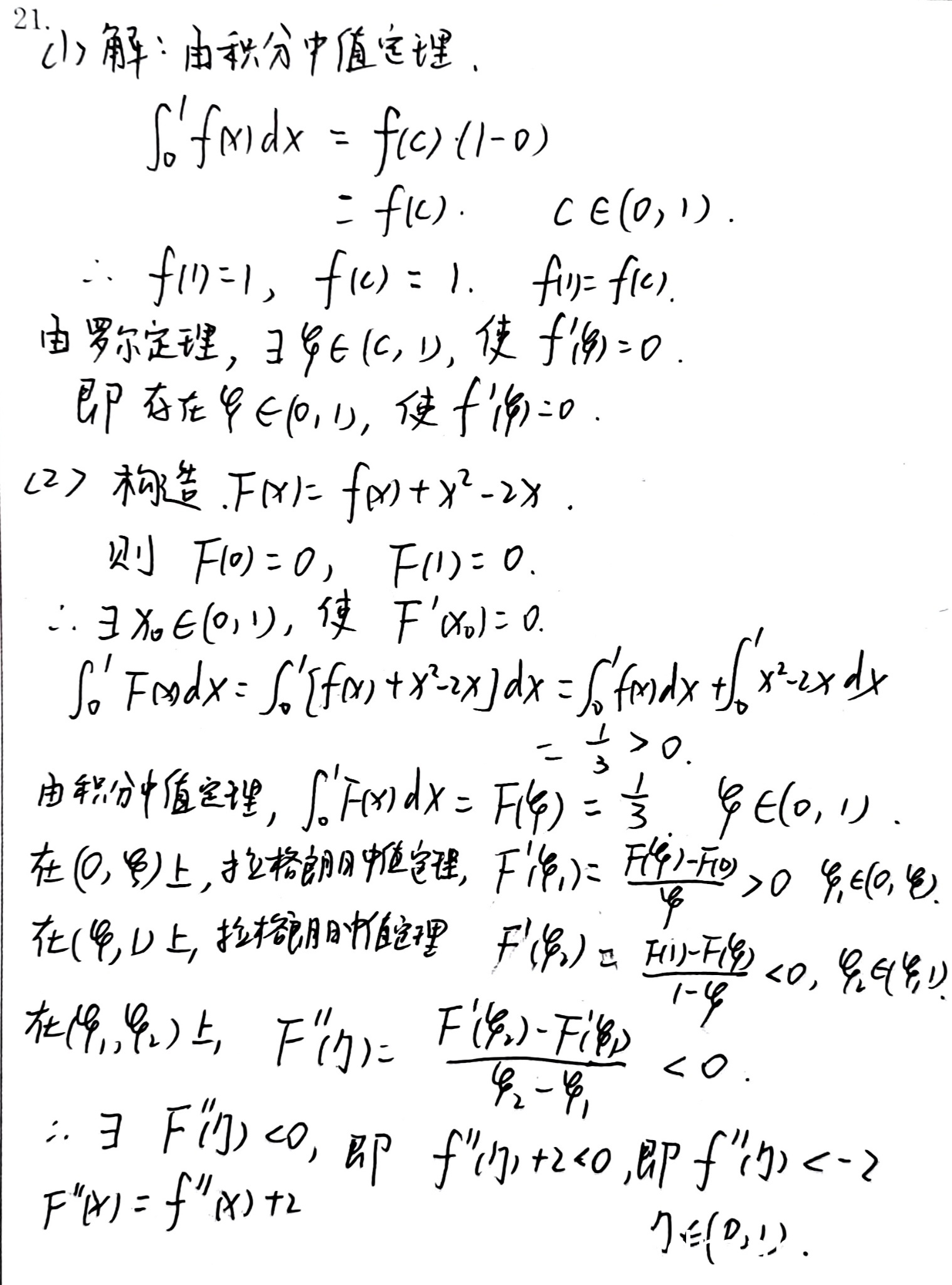 学生构造F(x)=f(x)+x²-2x,计算F(0)=0,F(1)=0,并得到∫₀¹F(x)dx=1/3>0。但在应用积分中值定理时,错误地得出存在η∈(0,1)使F(η)=1/3。实际上积分中值定理给出的是存在某点使函数值等于积分平均值,但这里积分平均值是1/3,而F(0)=F(1)=0,无法保证存在η使F(η)=1/3。这个逻辑错误导致后续推导的基础不成立。虽然构造函数的思路正确,但关键步骤存在严重逻辑错误。扣3分,得3分。