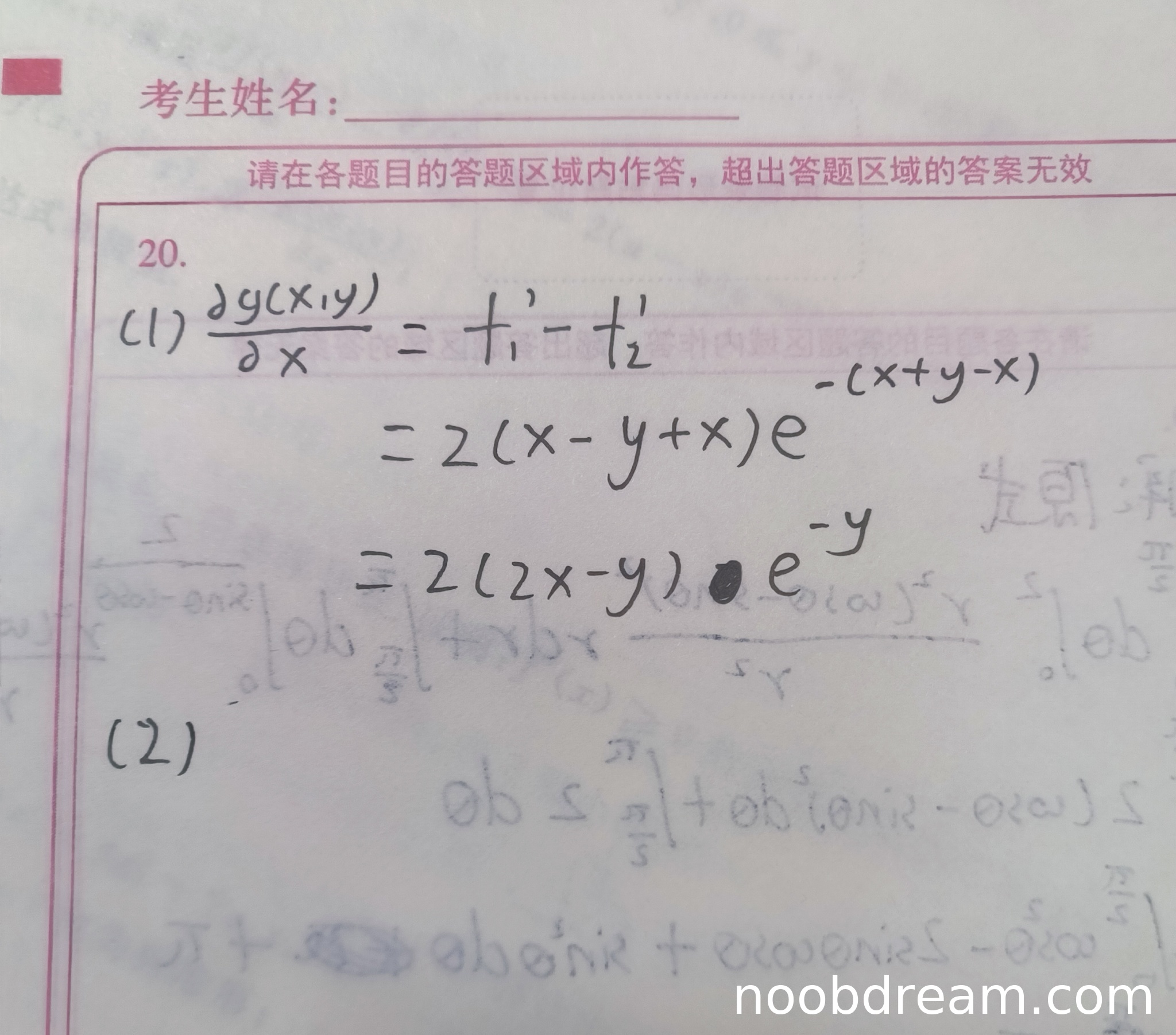 学生作答中给出了 \(\frac{\partial g(x,y)}{\partial x} = f_1' - f_2'\) 的链式法则形式,并代入已知条件得到 \(2(2x-y)e^{-y}\),这与标准答案一致。虽然书写中出现了 \(t_1'\) 和 \(t_2'\) 的符号(可能是识别错误或笔误),但根据上下文可以判断为对 \(f\) 的偏导数的误写,且最终结果正确。按照评分规则,逻辑正确且结果正确,不扣分。