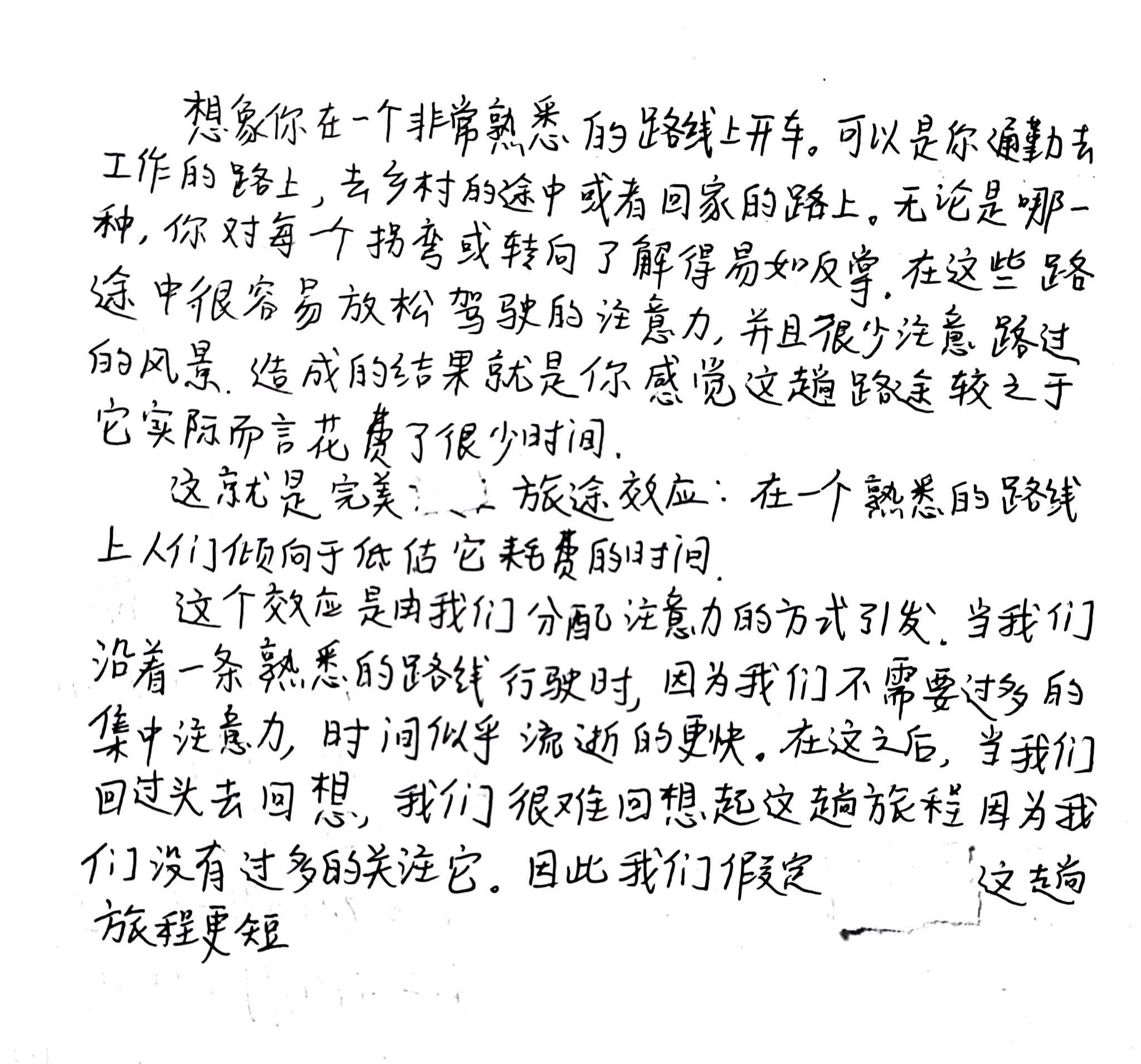 学生翻译完整传达了原文意思,语言流畅自然。虽然存在一些细微表达差异(如"完美旅途效应"应为"熟路效应"更贴切),但整体理解准确。根据评分标准,思路正确不扣分,识别中的微小差异不视为错误。两次识别结果基本一致,均能准确表达原文核心内容。