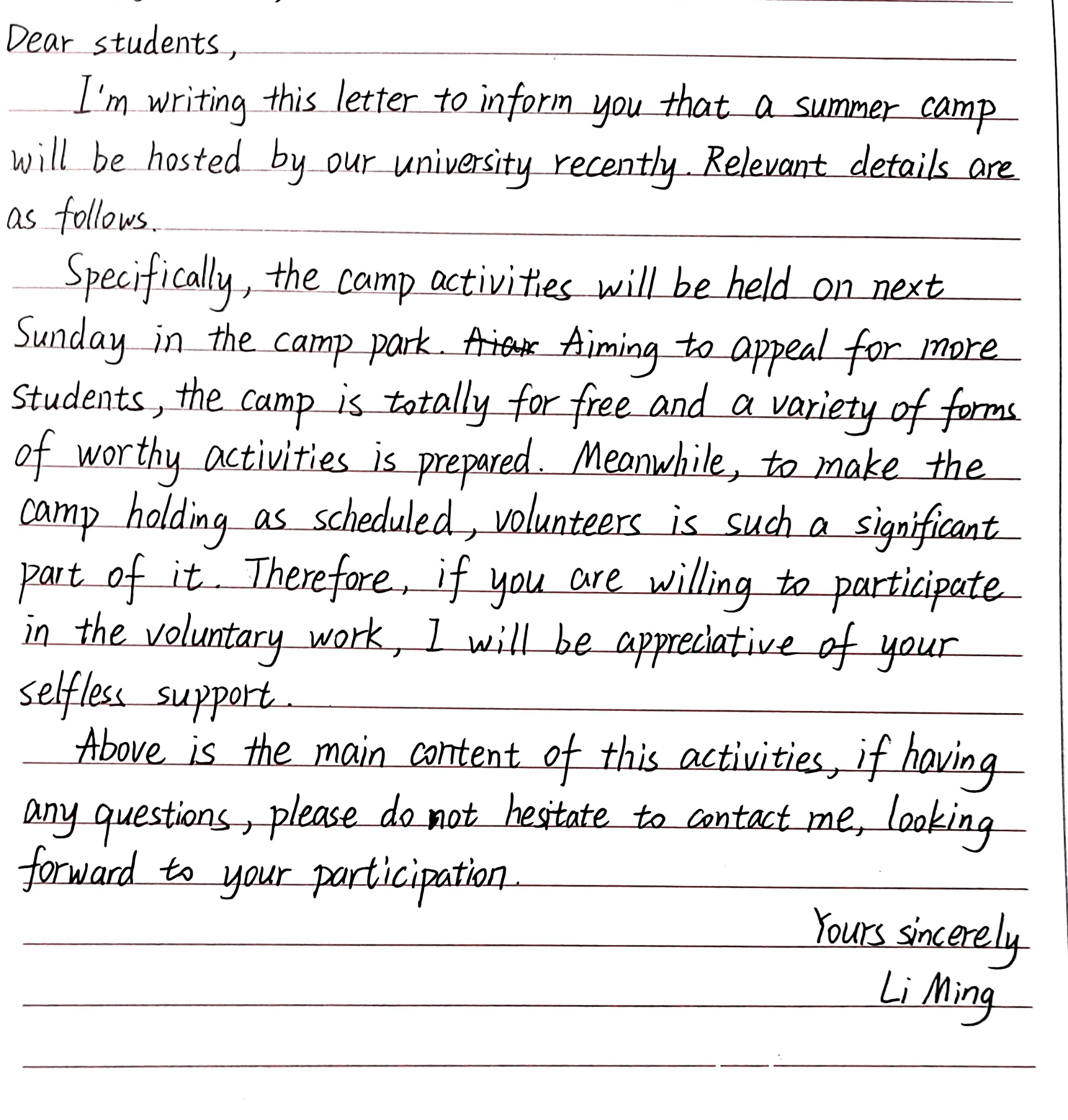 理由:作文基本完成了通知功能,提到了夏令营活动、时间、地点、免费性质、志愿者招募等要素。但内容不够具体明确,如"recently"和"next Sunday"存在时间矛盾,"camp park"地点表述模糊,"worthy activities"描述不清晰。关键信息如具体日期、活动内容、报名方式等缺失。