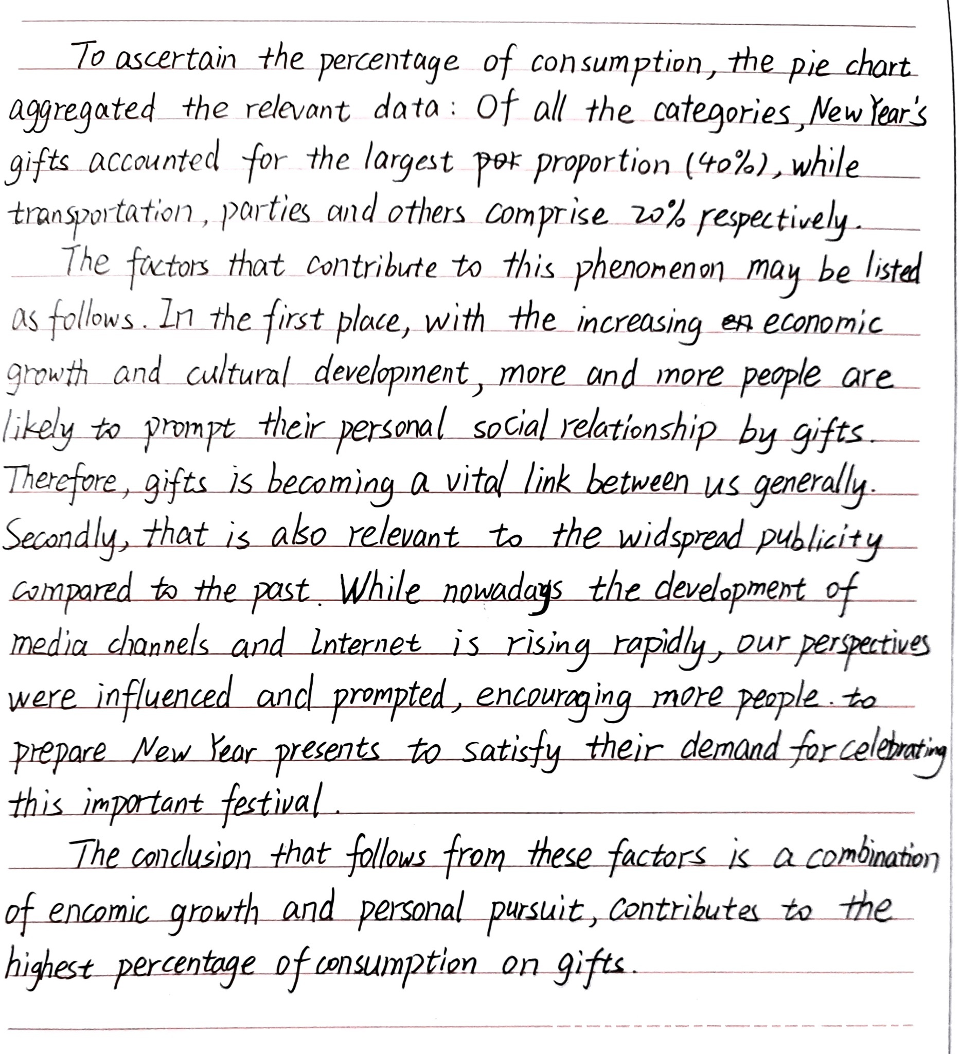 理由:学生基本完成了图表描述任务,准确指出了新年礼物占比最高(40%)和其他三项各占20%的数据。但在原因分析部分,只涉及了经济发展和媒体宣传两个角度,对聚会和交通消费的原因缺乏分析,漏掉了部分内容要点。