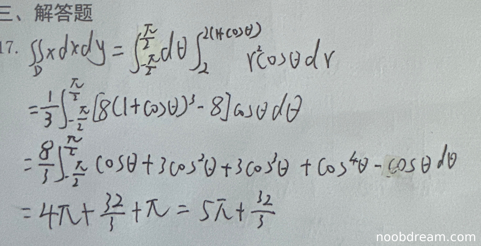 - 步骤三:展开(1+cosθ)³正确,但化简时出现了与第一次识别相同的错误,将cosθ+3cos²θ+3cos³θ+cos⁴θ-cosθ写成了cosθ+3cos²θ+3cos³θ+cos⁴θ。扣1分。