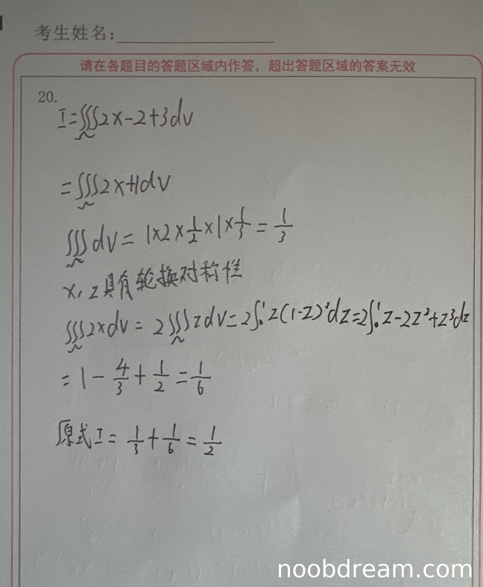学生声称"x,z具有轮换对称性"并得出\(\iiint 2xdV = 2\iiint zdV\),这是错误的。在给定区域Ω中,x和z的积分限不对称(x从0到1,z从0到1-x-y/2),不存在轮换对称性。虽然最终计算出的\(\iiint 2xdV = \frac{1}{6}\)数值正确,但这是巧合,逻辑错误严重,扣3分。