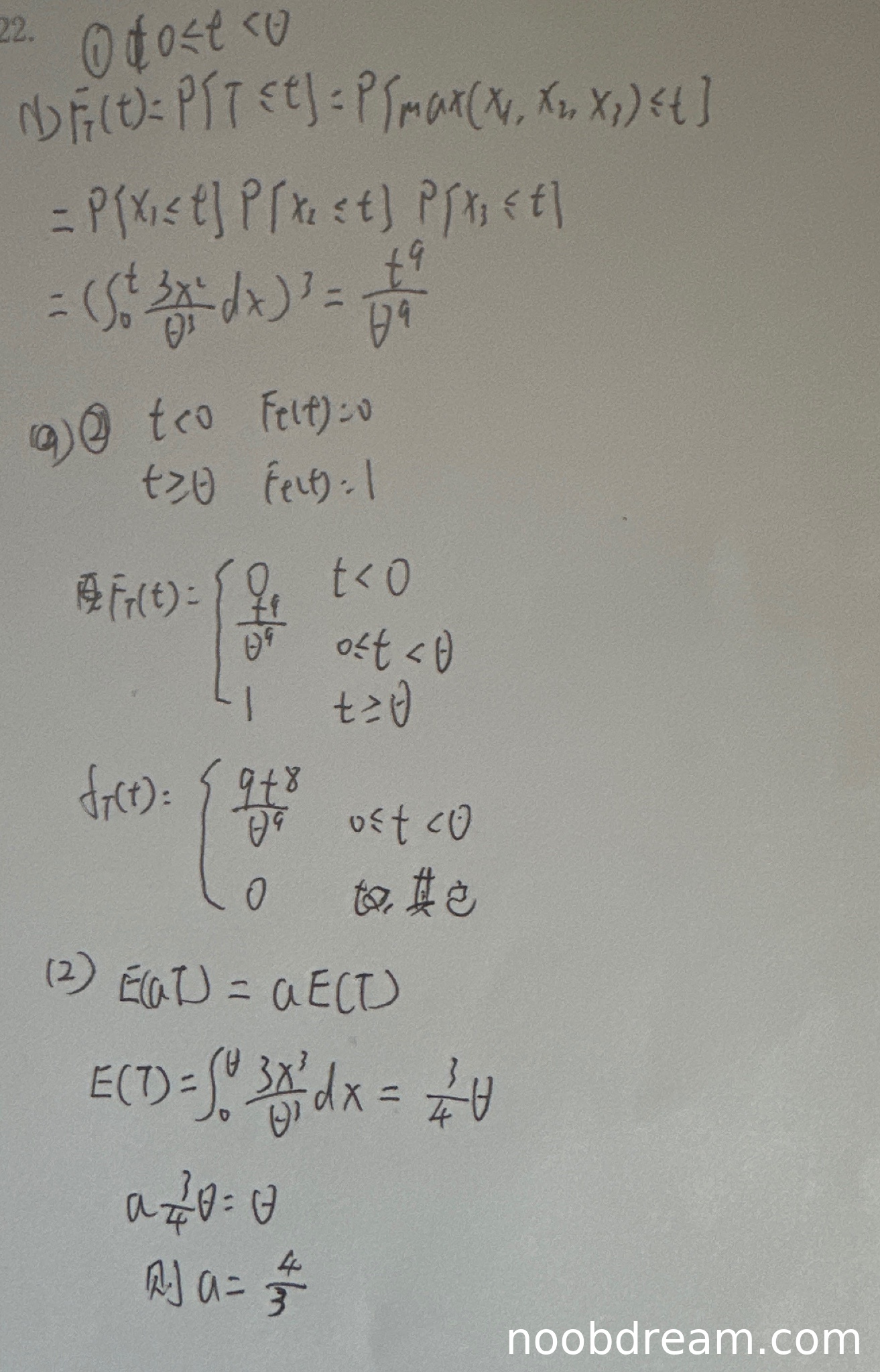 学生正确推导了T的分布函数和概率密度函数。在计算分布函数时,正确使用了独立同分布样本最大值的分布函数公式,积分计算正确,求导得到概率密度函数也正确。虽然第一次识别结果中概率密度函数的定义域写为"0 ≤ t < θ"(包含0),而标准答案为"0 < t < θ"(不包含0),但这是连续型随机变量概率密度函数在单点取值不影响概率,属于非本质差异,不扣分。因此本题得满分5分。