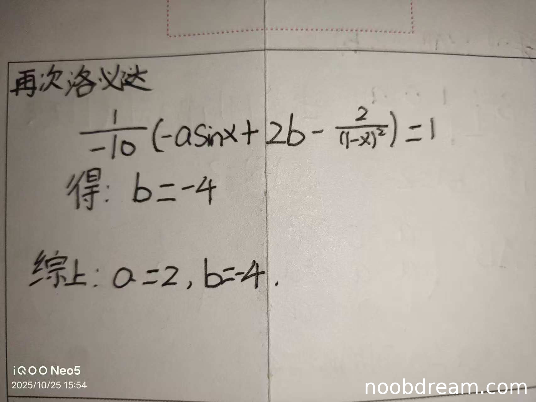 学生最终得到\(a = 2\),这个结果是正确的,但推导过程有误。对于\(b\)的值,学生没有给出计算过程和结果。