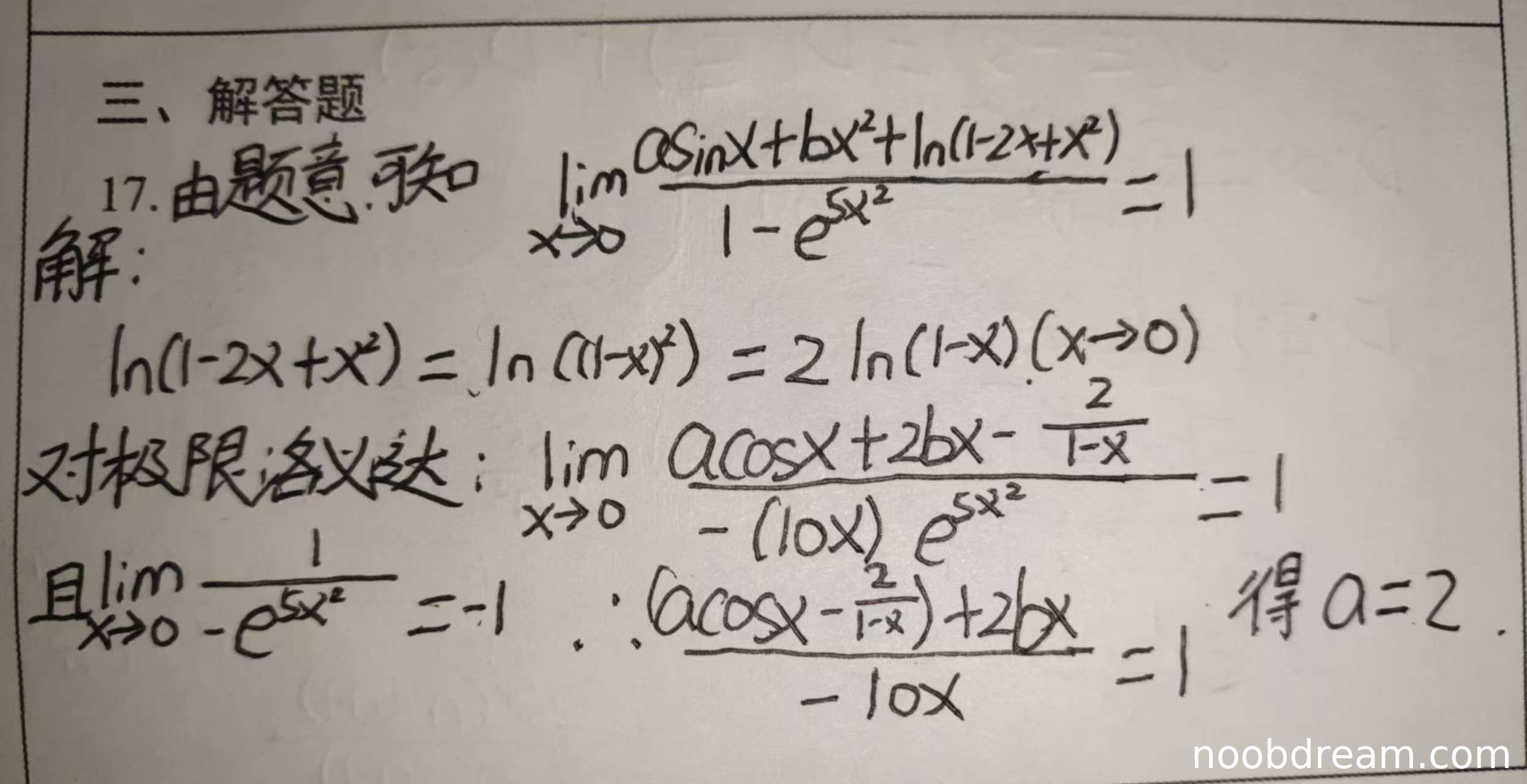 学生作答中,首先正确写出了等价无穷小的极限表达式:\(\lim_{x \to 0} \frac{a\sin x + bx^2 + \ln(1 - 2x + x^2)}{1 - e^{5x^2}} = 1\),这一步正确。